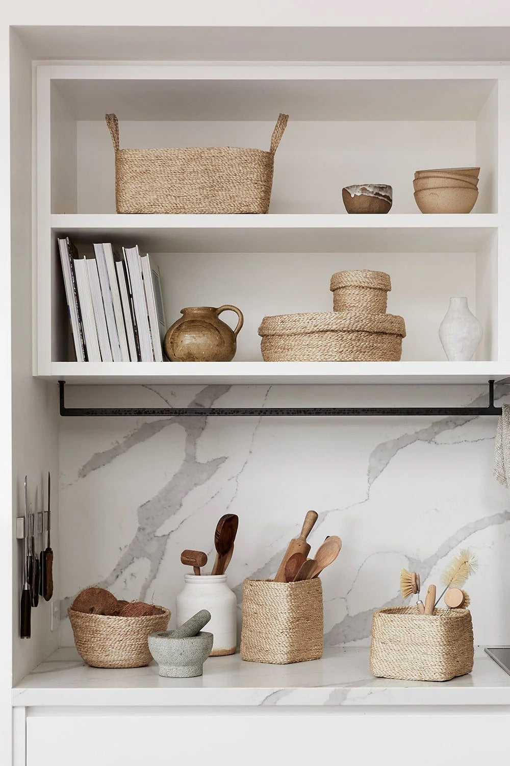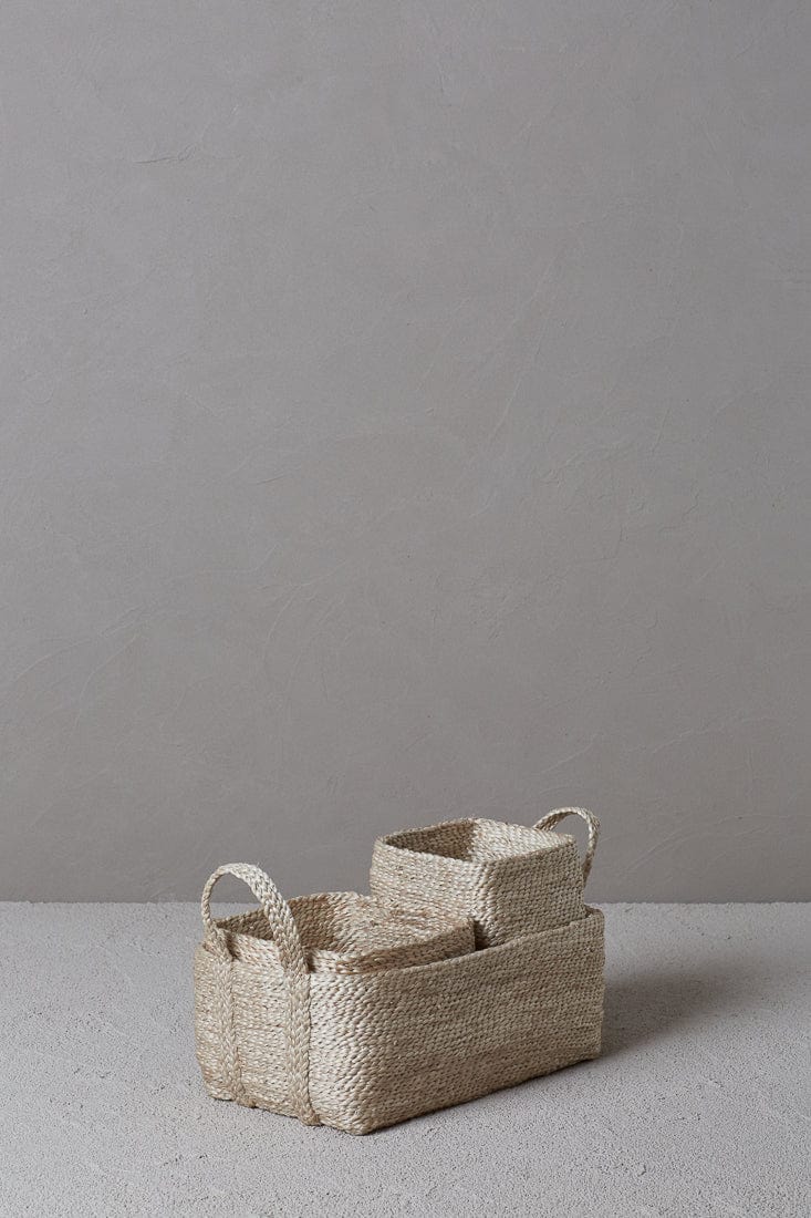 Trio of Small Jute Baskets består av tre håndlagde kurver i ulike størrelser – perfekte til alt fra kjøkkenredskaper, penner og hobbyprosjekter til smykker, småplagg eller som en hyggelig detalj på gjesterommet.