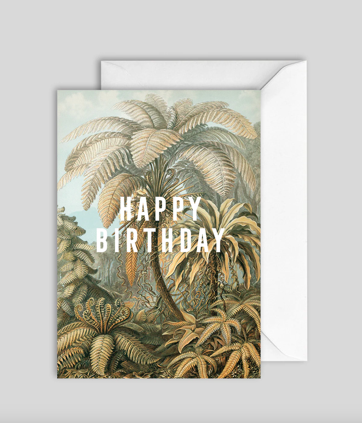 Happy Birthday kort - regnskog. Kortet er trykt på teksturert FSC-merket 270 gsm kartong, individuelt pakket med en hvit resirkulert konvolutt.