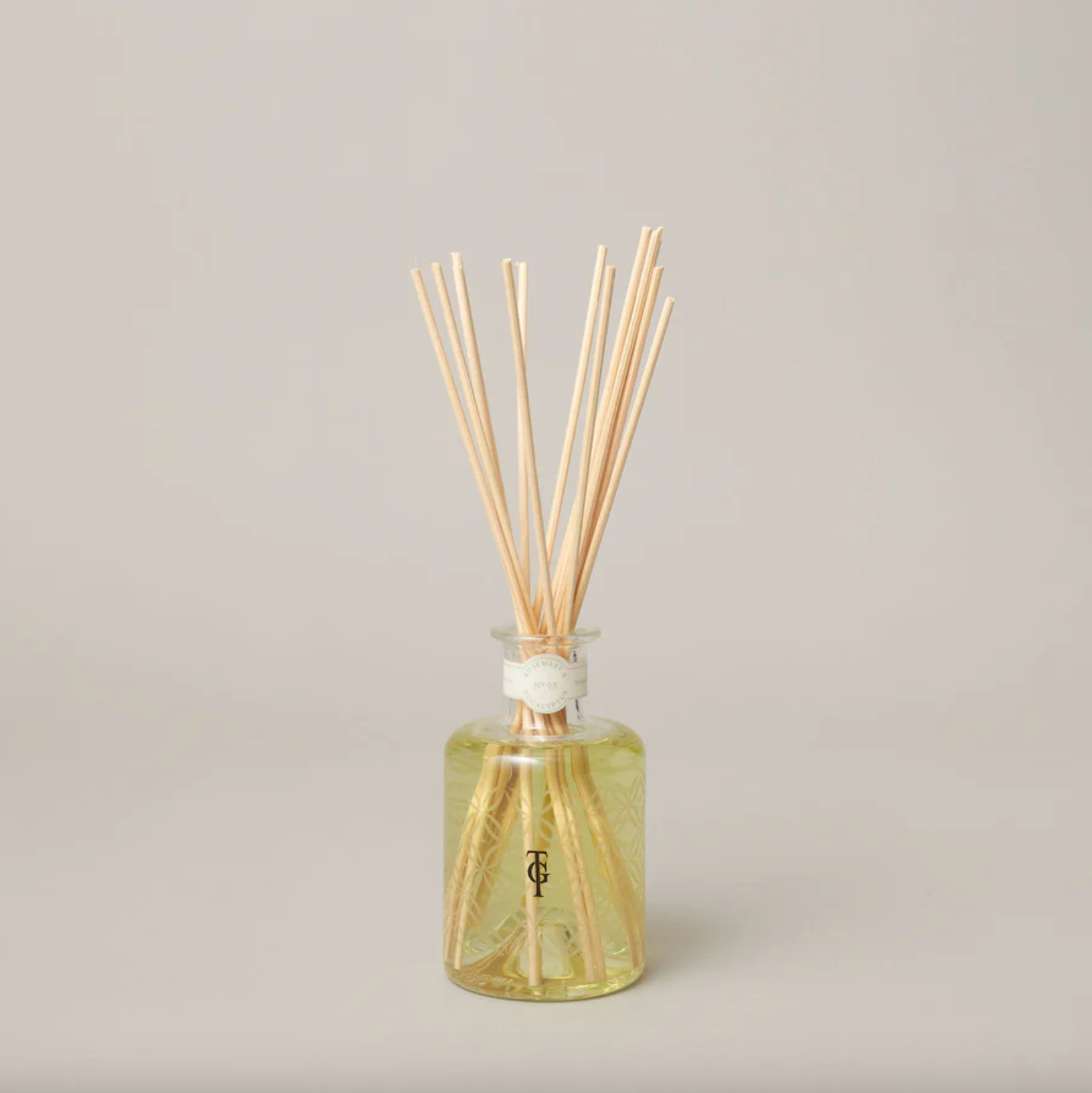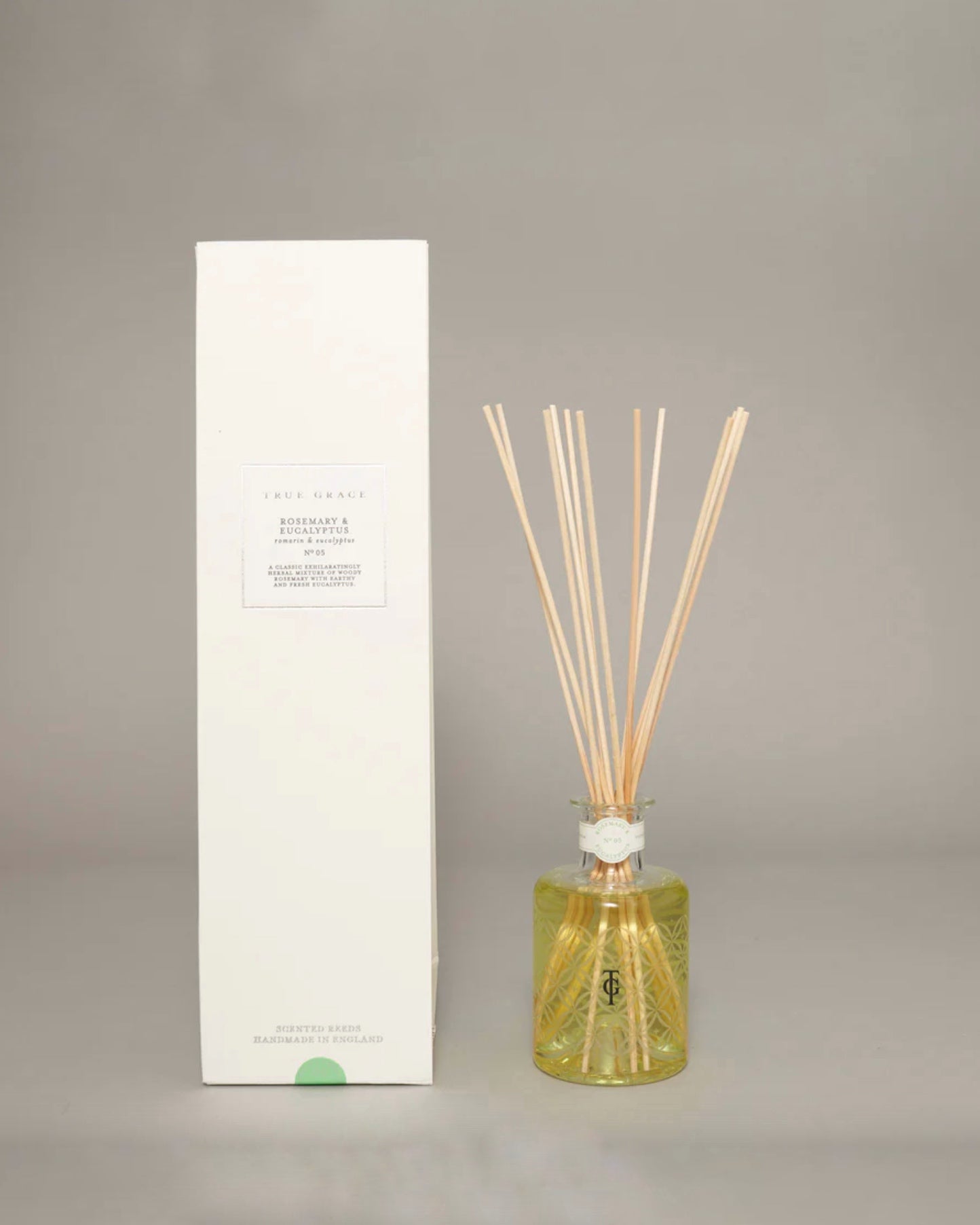 True Grace Rosemary & Eucalyptus Diffuser Set fyller rommet med en frisk og ren duft. Laget i små partier ved vår fabrikk i Wiltshire og duftende med noter av røkelse, rosmarin og eukalyptus, er denne Village-diffuseren perfekt for å holde badet eller kjøkkenet friskt. Presentert i en tidløs glassflaske med etsende effekt, inneholder denne diffuseren 20% duft - tilsvarende en "ren parfyme" - og holder seg frisk i opptil 10 uker. Stilig og underspilt, med en bunt av naturlige rattanpinner.