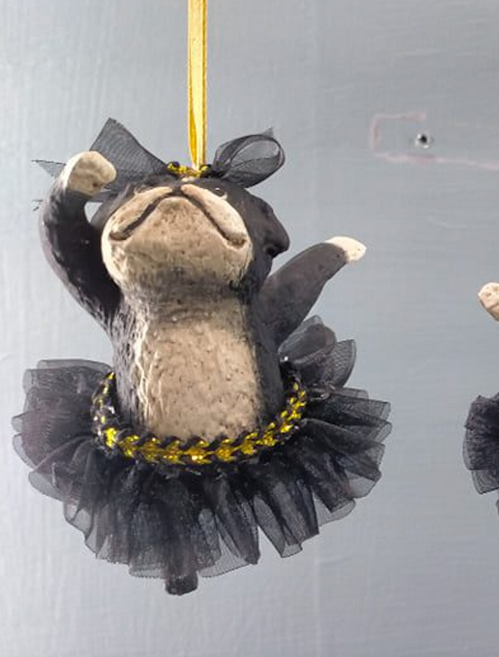 Dansende doggylitas med skjørt. Søte hunder i sort og hvit, med sort tyllskjørt med detaljer i gull. Heng disse vofsene på treet for et morsomt uttrykk.