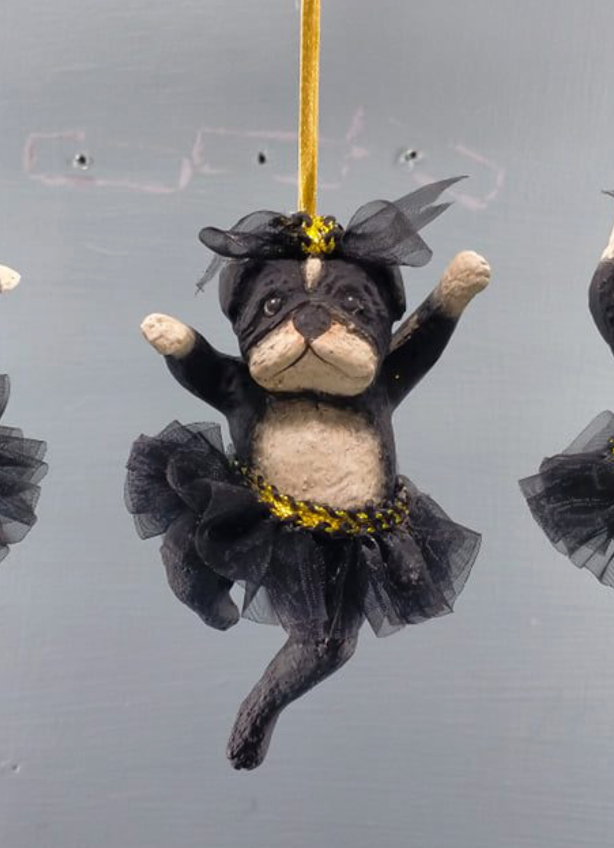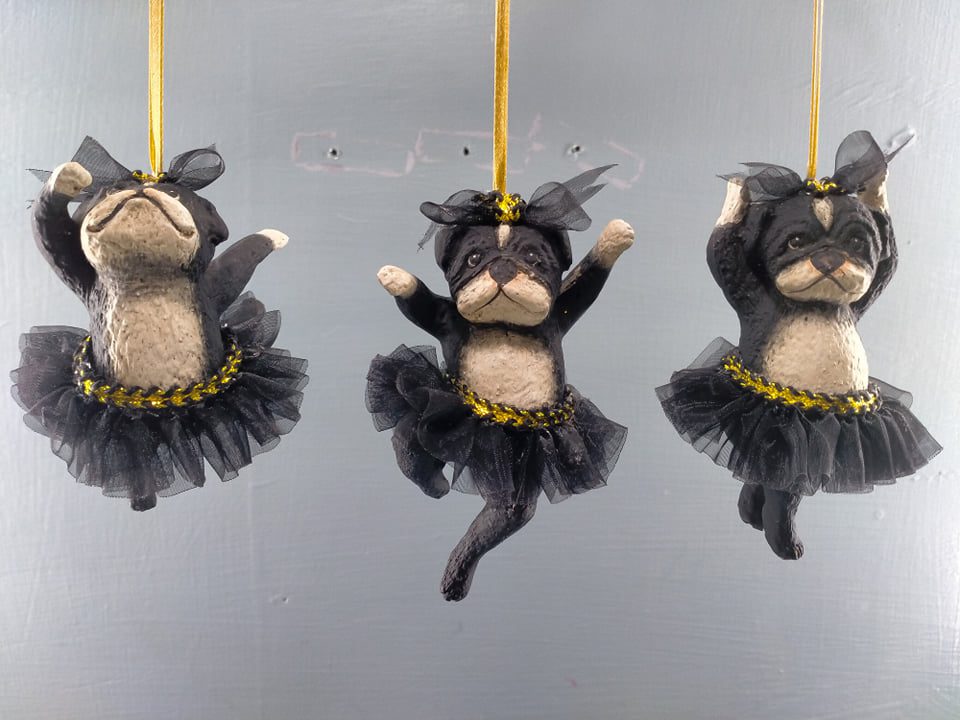Dansende doggylitas med skjørt. Søte hunder i sort og hvit, med sort tyllskjørt med detaljer i gull. Heng disse vofsene på treet for et morsomt uttrykk.