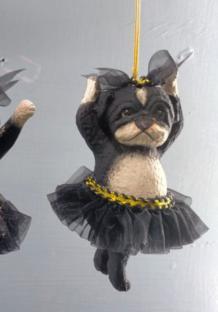 Dansende doggylitas med skjørt. Søte hunder i sort og hvit, med sort tyllskjørt med detaljer i gull. Heng disse vofsene på treet for et morsomt uttrykk.