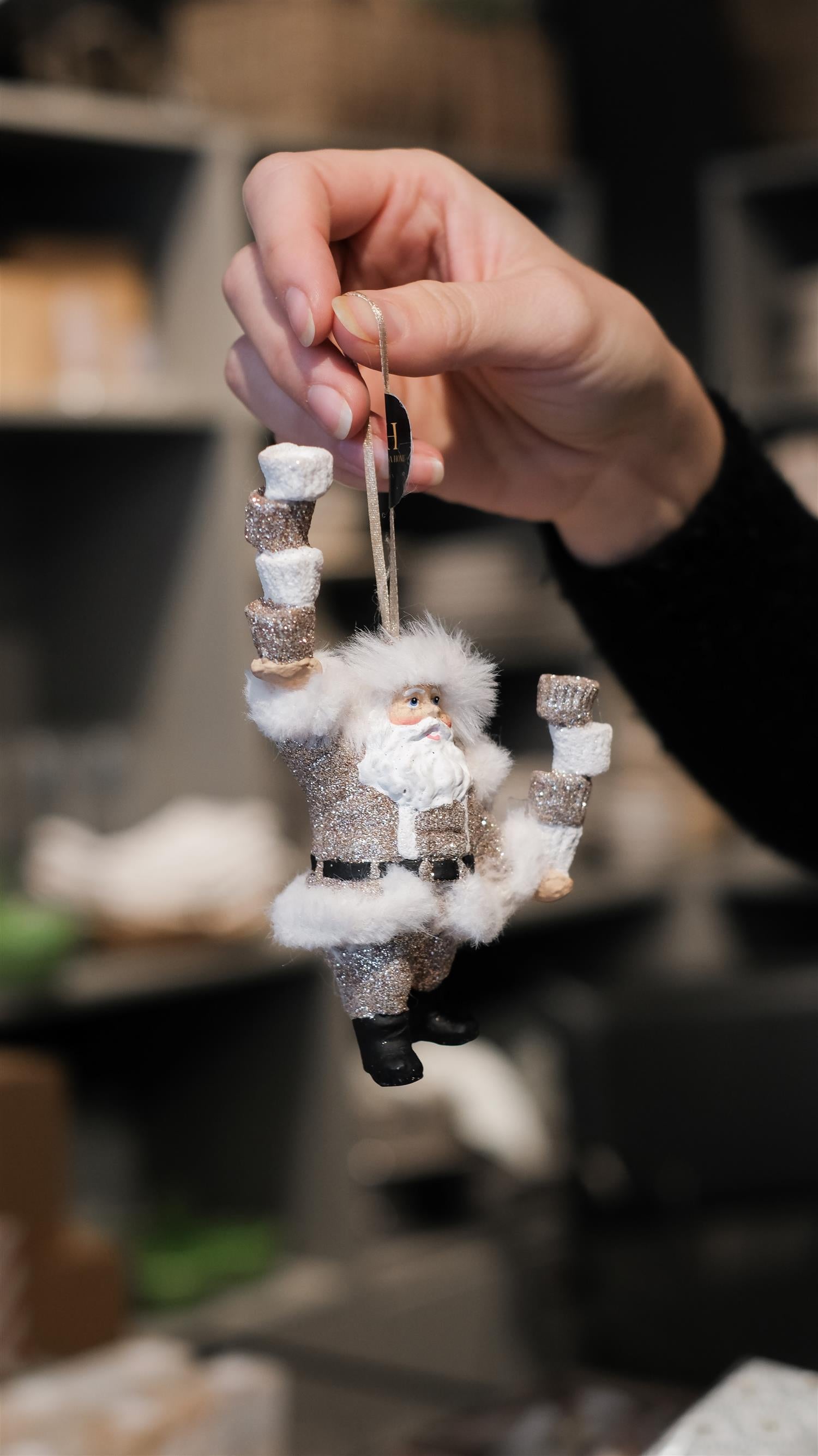 Glitrende nisse med sjokoladetårn. Nissen er kledd i en champagnefarget nissedrakt med glitrende detaljer og balanserer høye tårn med sjokolade. Et glitrende tilskudd til juledekorasjonene dine.