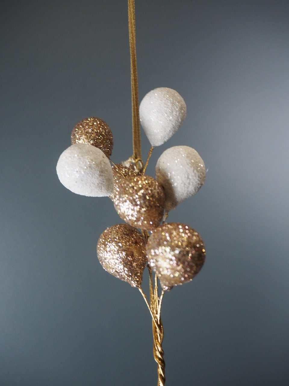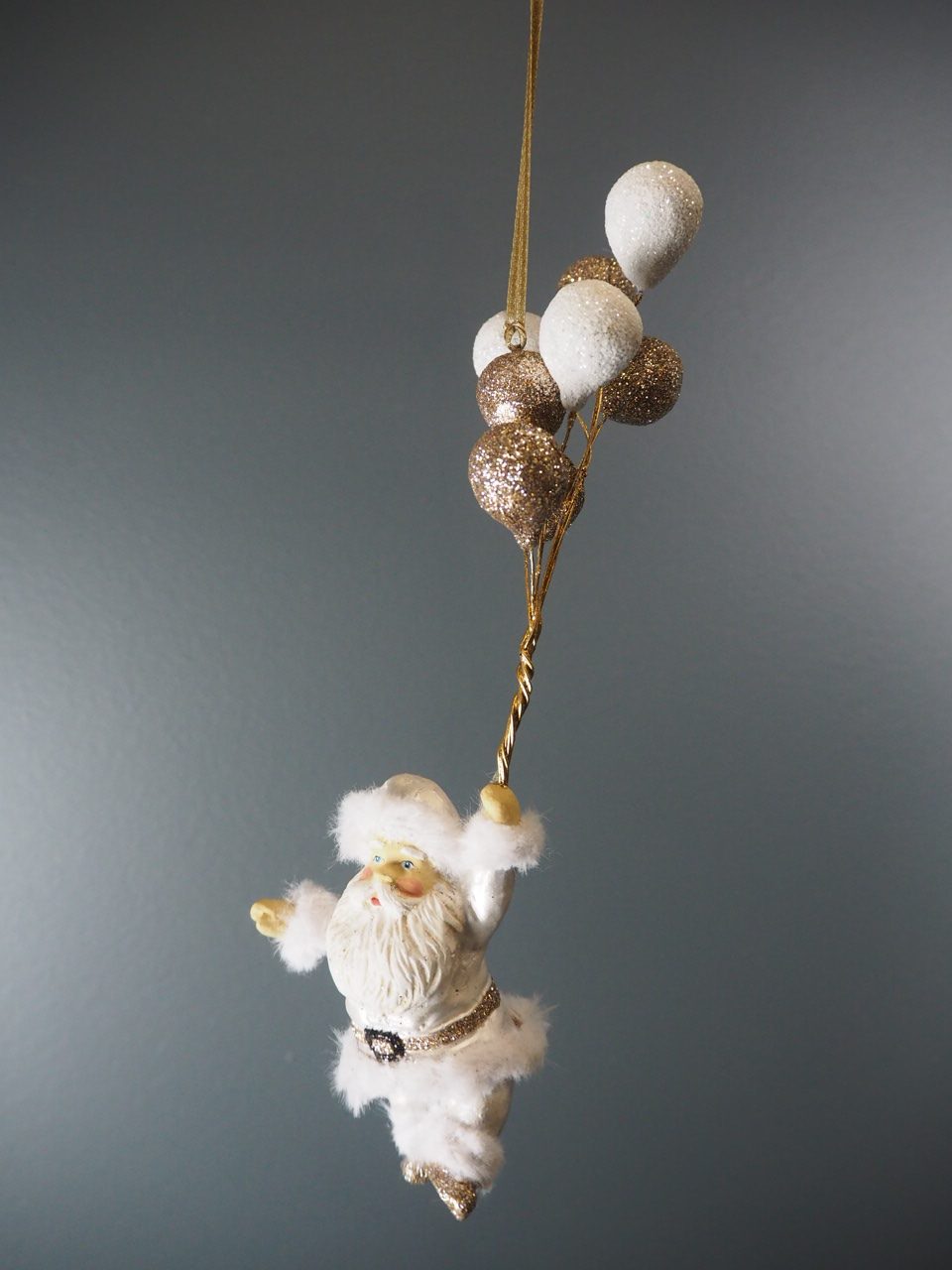 Nissen svever med heliumballonger! Kledd i hvit drakt med glitrende champagnedetaljer, med ballonger som glitrer i hvitt og champagne.