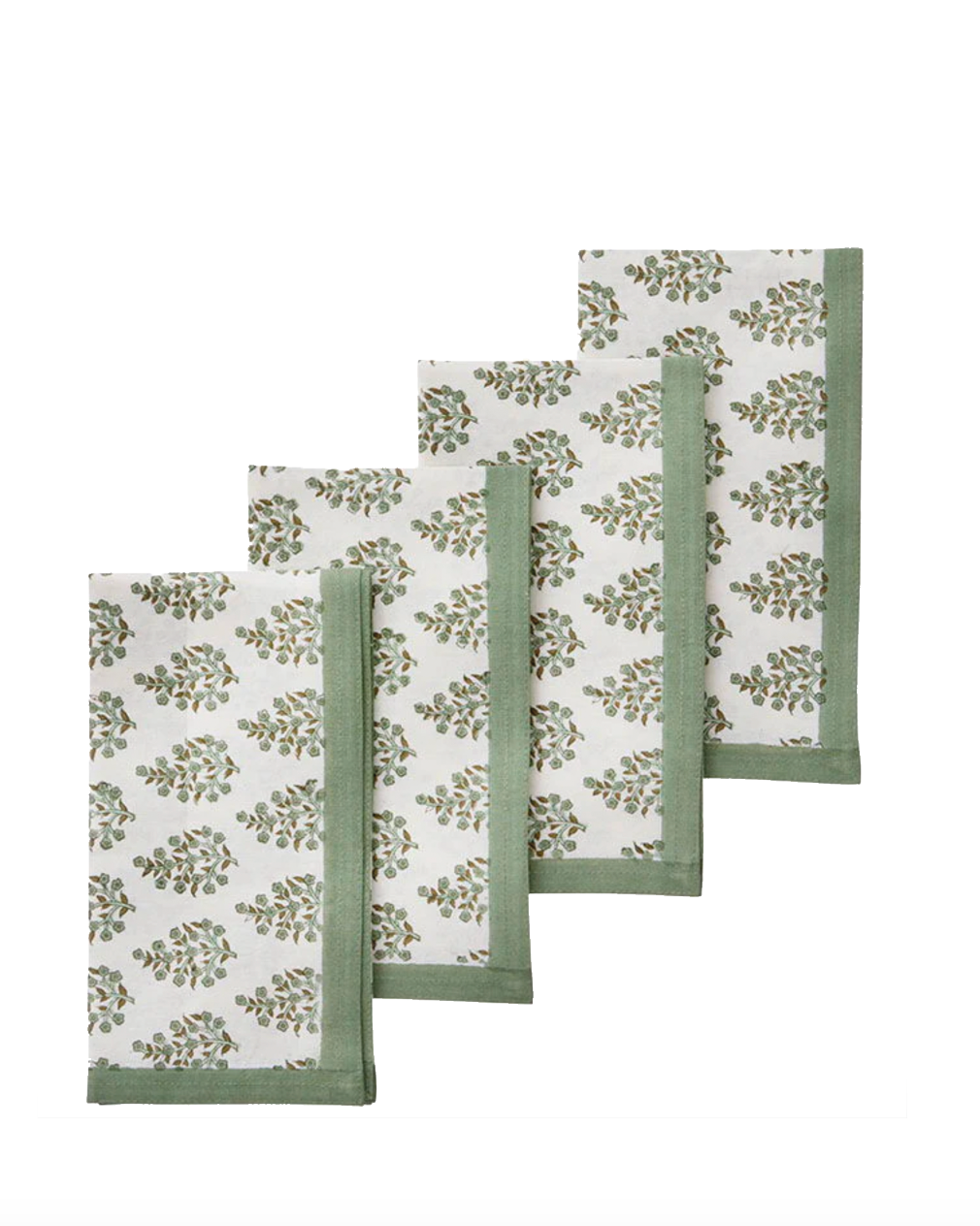 Sett med fire servietter med håndlaget blokktrykk i grønne nyanser. 100% bomull.