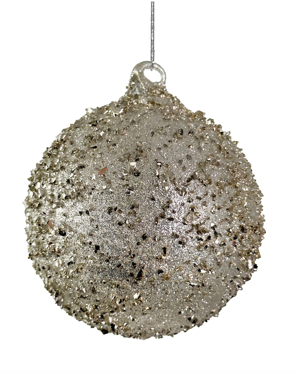 Julekule i glass. Sølvfarget med glitter. En festlig kule som skinne hele julen.