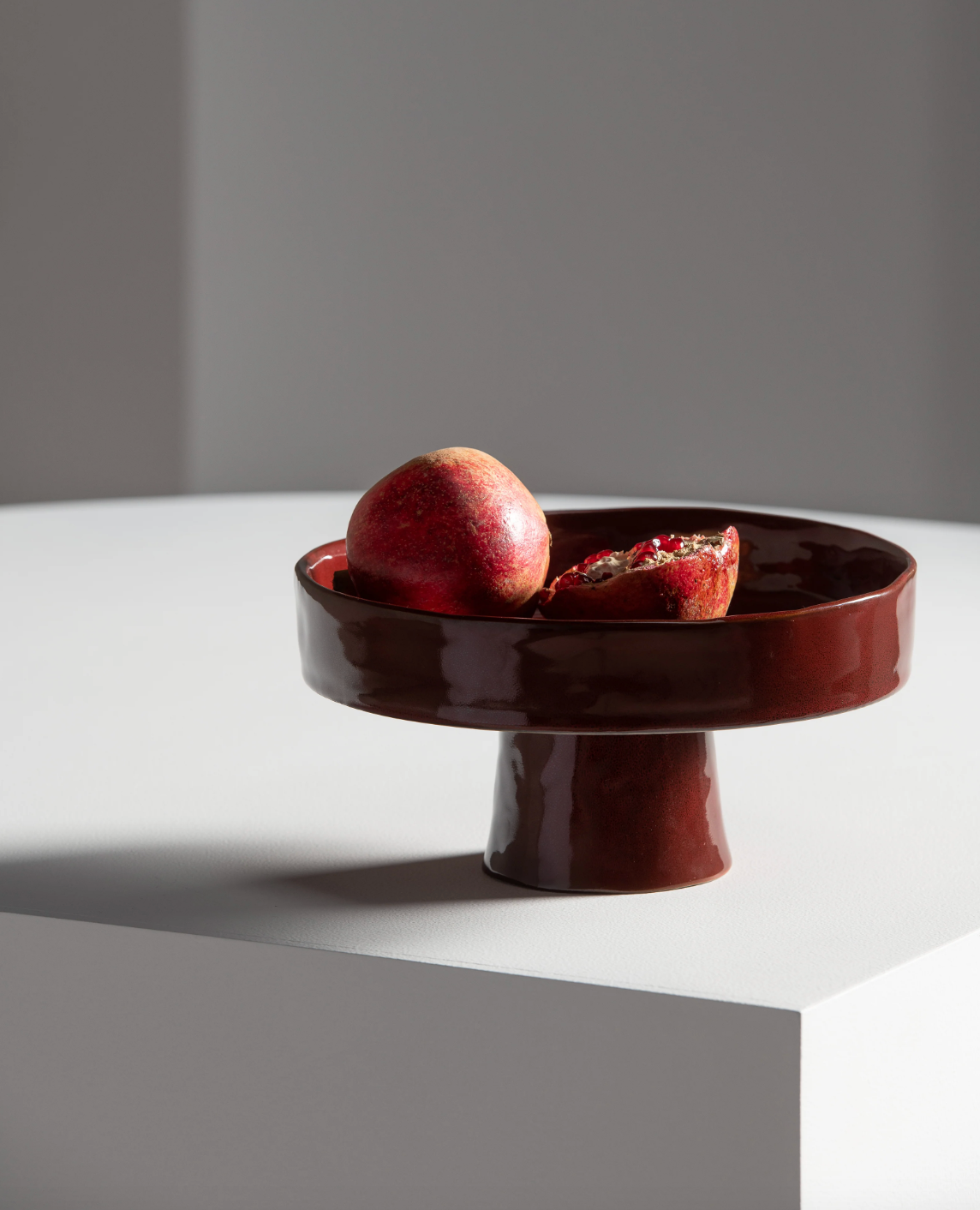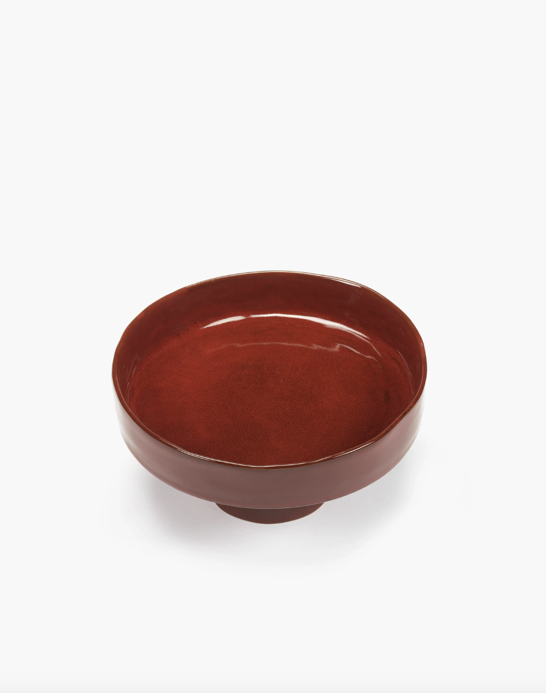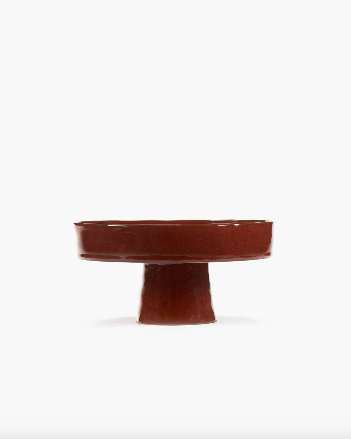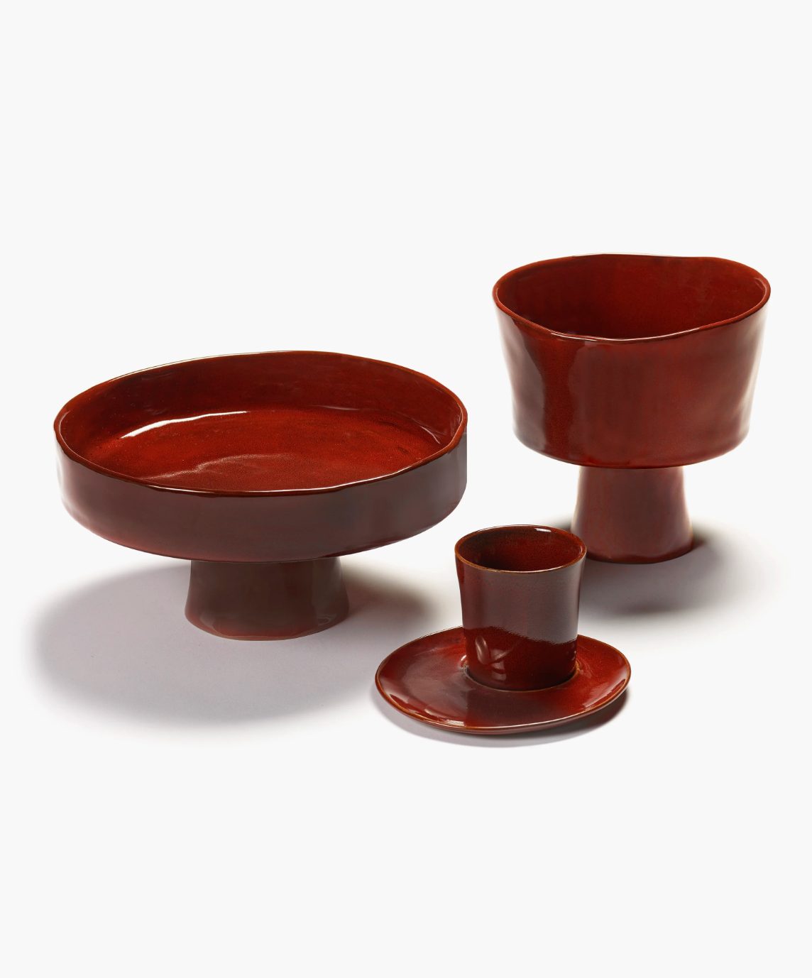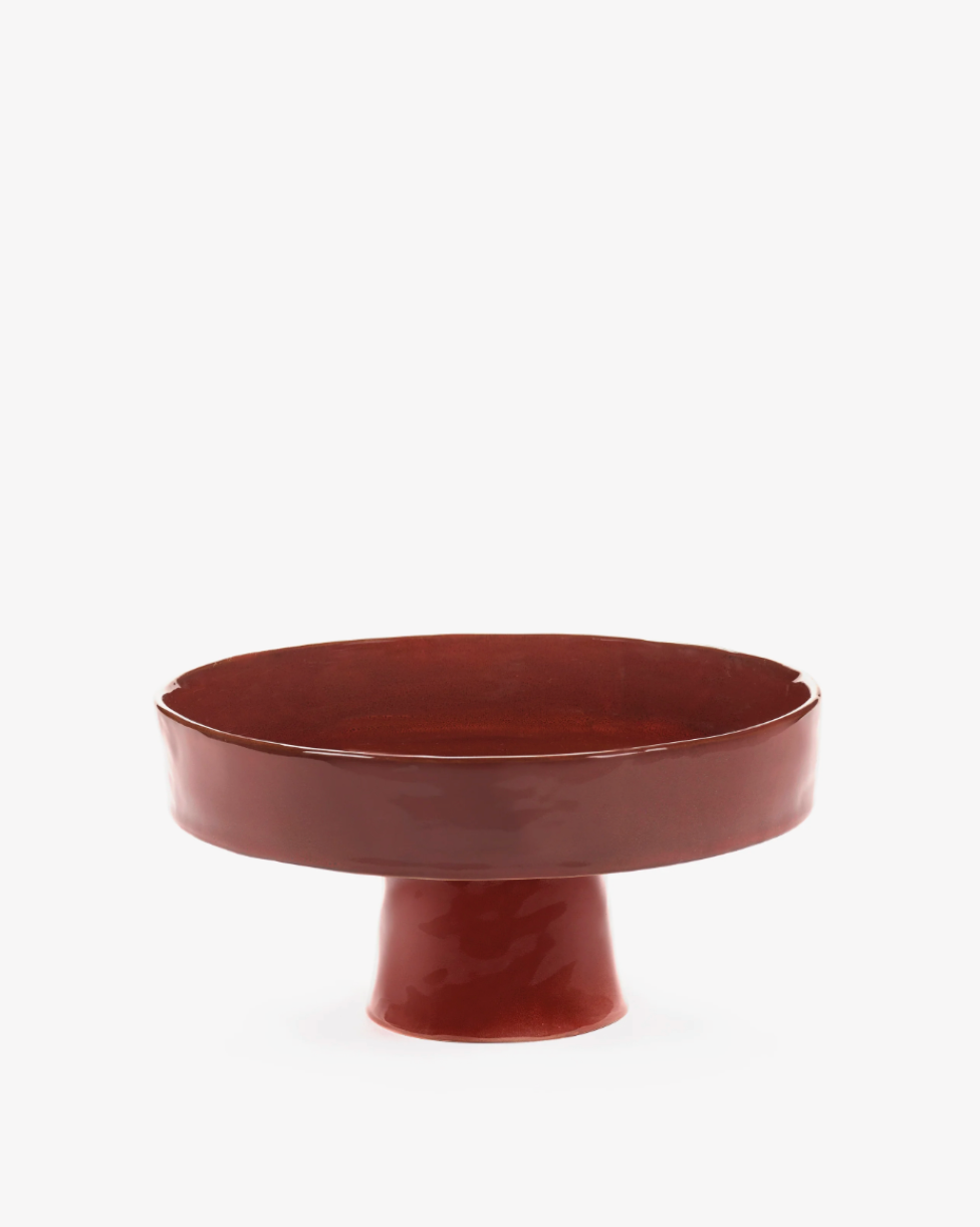 Steintøysfat på fot fra Serax. Fatene er både funksjonelle og vakre takket være den håndverksmessige tilnærmingen og karakterfulle materialene som designer Marie Michielssen valgte å bruke. Disse fatene, som har fått en rød glasur, er en del av La Mère-kolleksjonen.