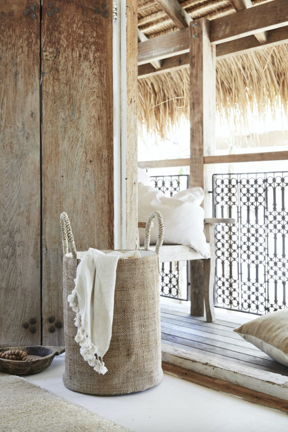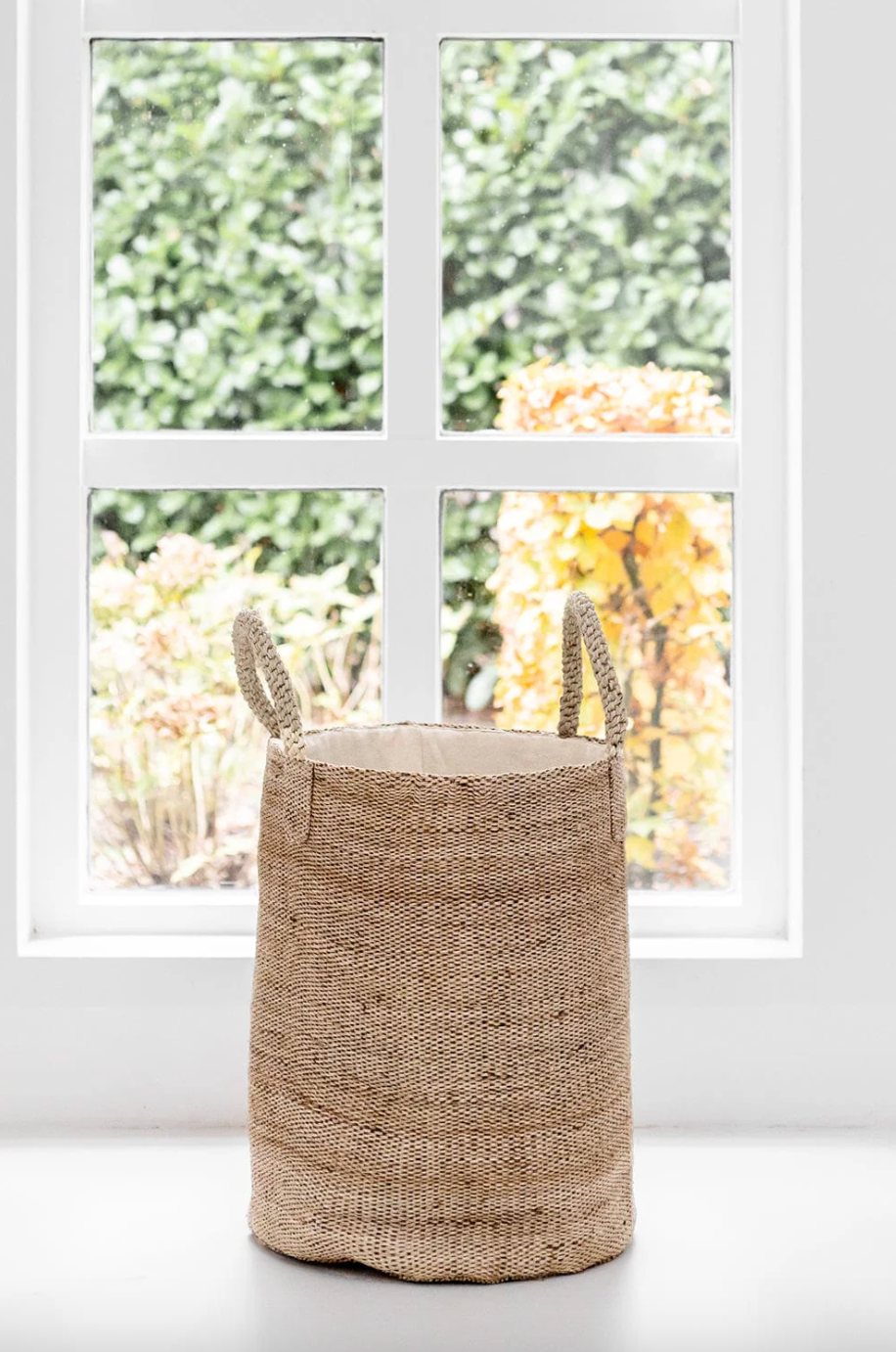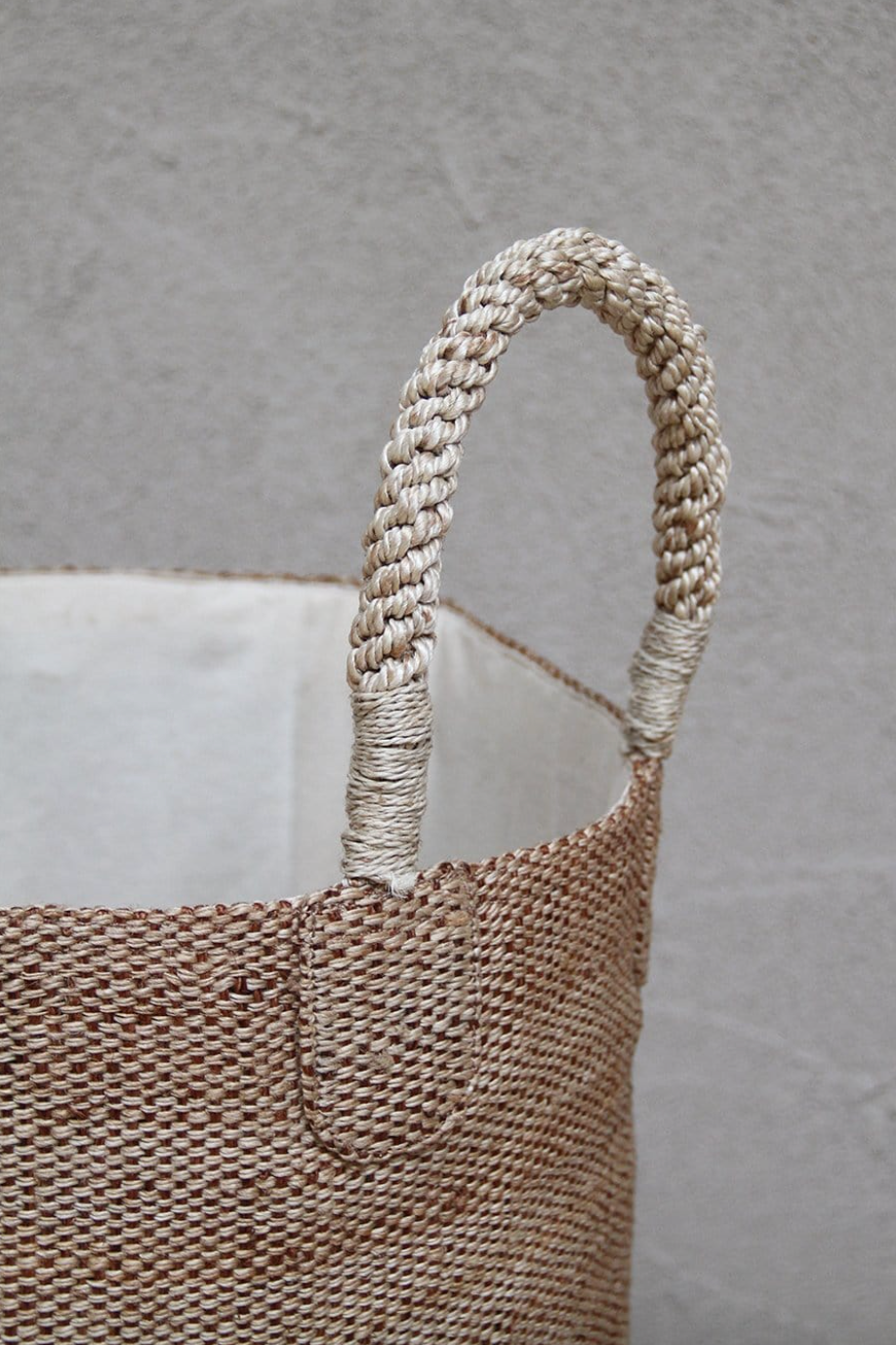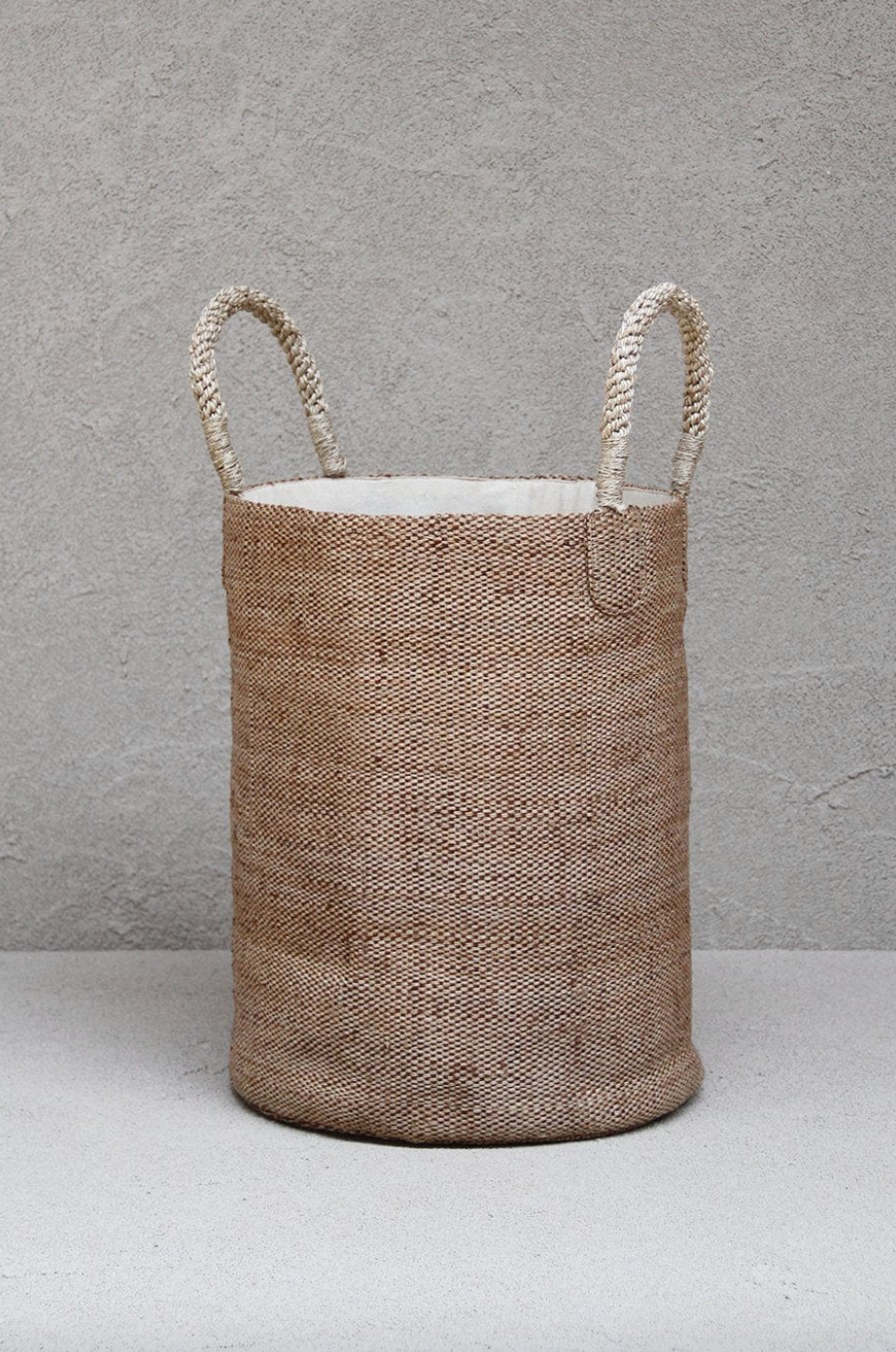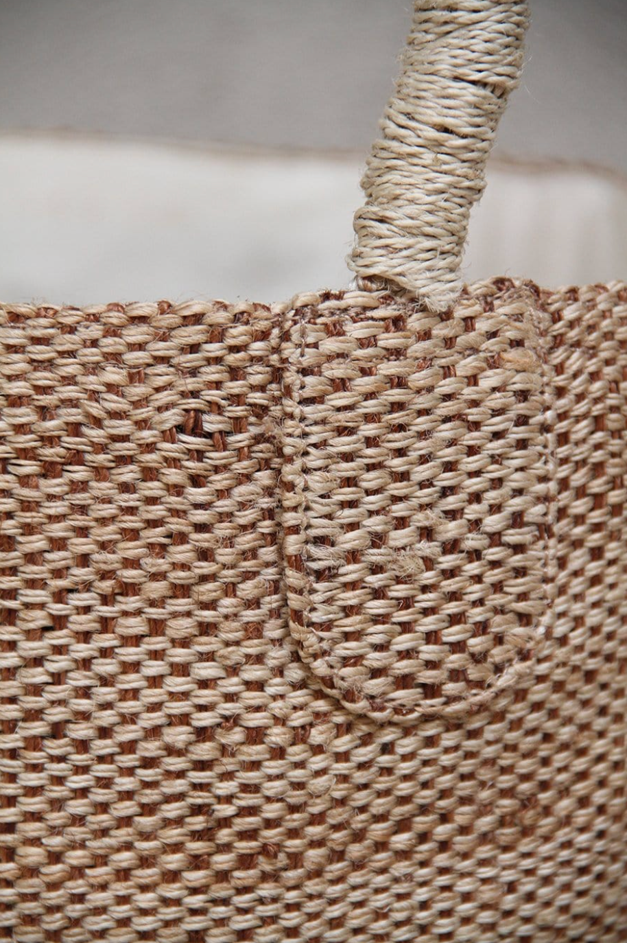 Den rustikke utsiden består av en unik blanding av naturlig farget brun jute og naturlig jute, mens innsiden er foret med myk, håndvevd bomull – perfekt for oppbevaring av de mykeste klærne eller spesielle skatter. Kurvens sterke håndknyttede macraméhåndtak gjør den både solid og iøynefallende.