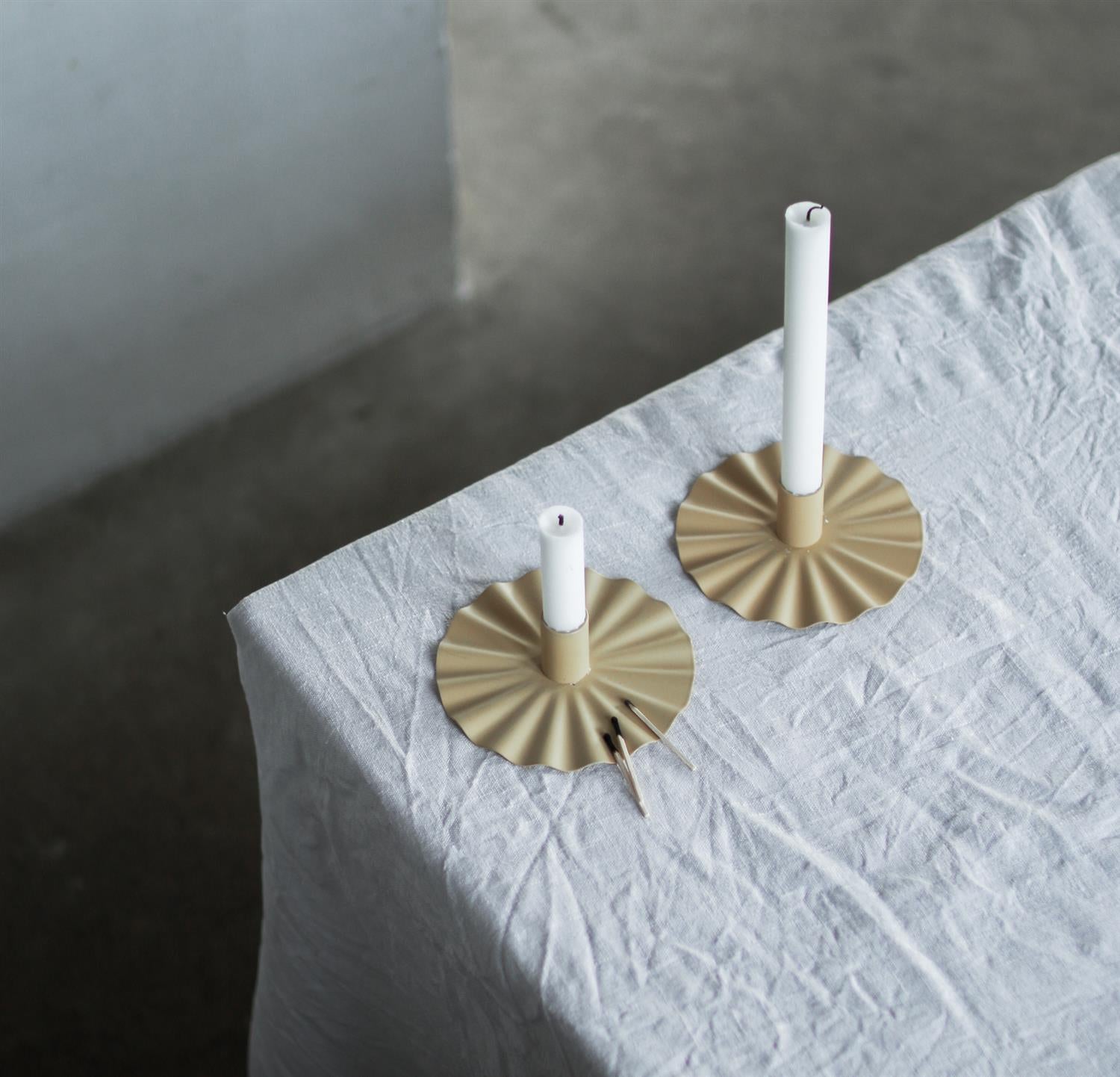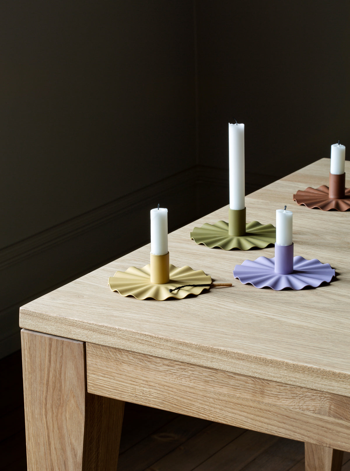 Krum lysestake i Bloom yellow fra Ygg & Lyng er en moderne tolkning av den klassiske lysestaken, inspirert av naturens bølgende former i vann, sand og bølger. Den flate, bølgete formen i lakkert metall gir et grafisk og skulpturelt uttrykk, som gjør den like dekorativ uten lys som med. Krum skaper en lun atmosfære og tilfører en kunstnerisk detalj til interiøret.