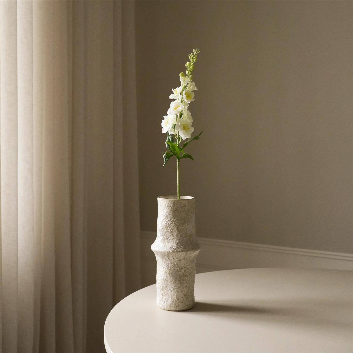 White Delphinium fra Botané er en høyreist og elegant kunstblomst med flere lagdelte blomster i ren hvit nyanse og delikate, lysegule midtpartier. Blomstene er vakkert plassert langs en strukturert grønn stilk, ledsaget av dypt flikete grønne blader som tilfører et naturlig uttrykk. Stilkens høyde er 70 cm, og den egner seg perfekt som en del av en bukett eller alene i en dekorativ vase.