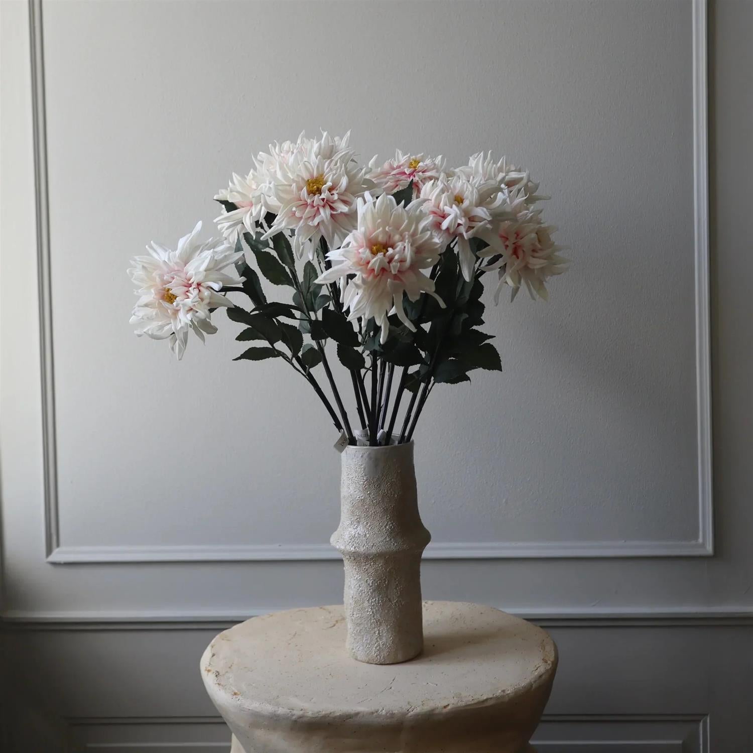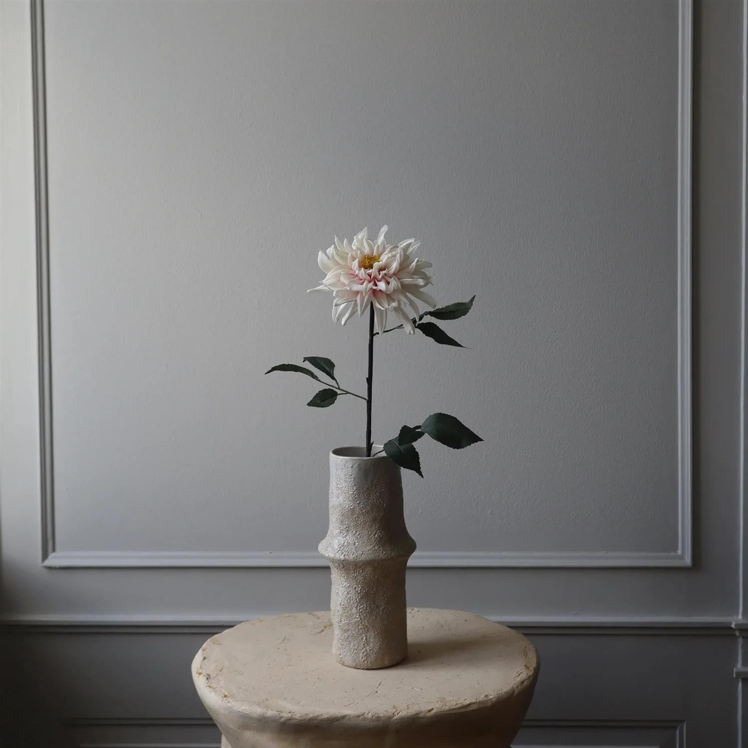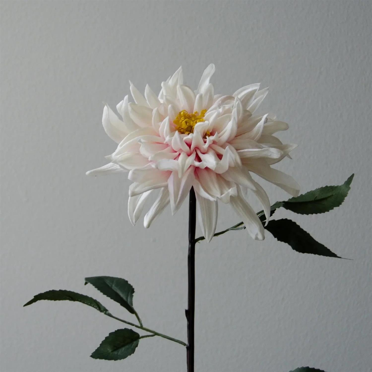 Denne vakre Light Pink Cactus Dahlia har delikate, fint spissede kronblader i myk elfenbenshvit med lette rosatoner mot midten. De mange lagene av smale kronblader sprer seg utover i en strukturert og voluminøs form som gir et naturlig blikkfang i enhver bukett eller vase. Blomsten bæres av en slank, mørk stilk med noen dype grønne blader langs lengden. Total høyde: 72 cm.