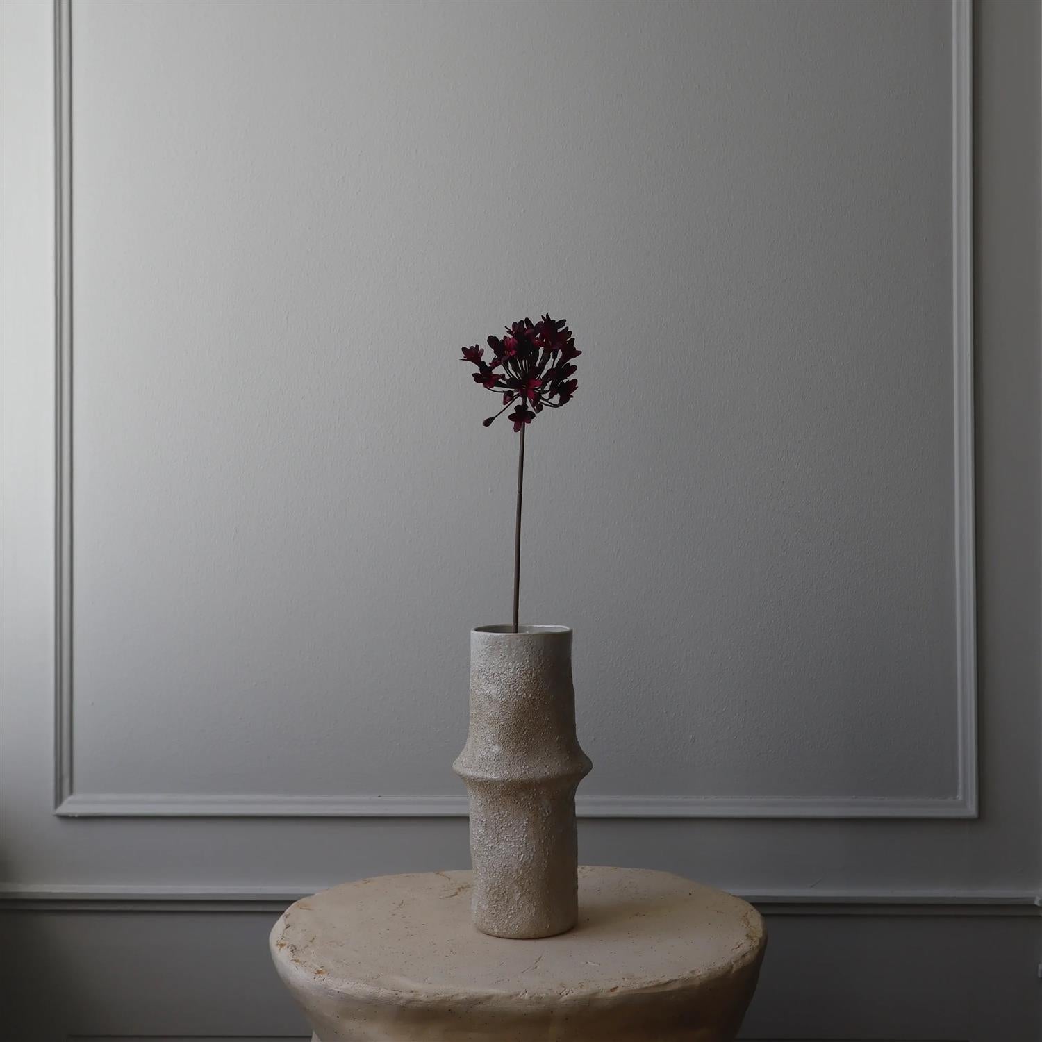 Dark Red Agapanthus er en elegant stilkblomst med en sfærisk klynge av små, trompetformede blomster i dyp rødt med hint av burgunder. De fløyelsmyke kronbladene varierer subtilt i tone og gir blomsten liv og dybde, mens smale, langstrakte knopper skyter ut fra midten og tilfører en luftig struktur. Den støttes av en lang, slank stilk i dempet brunfarge og måler 75 cm i høyden.