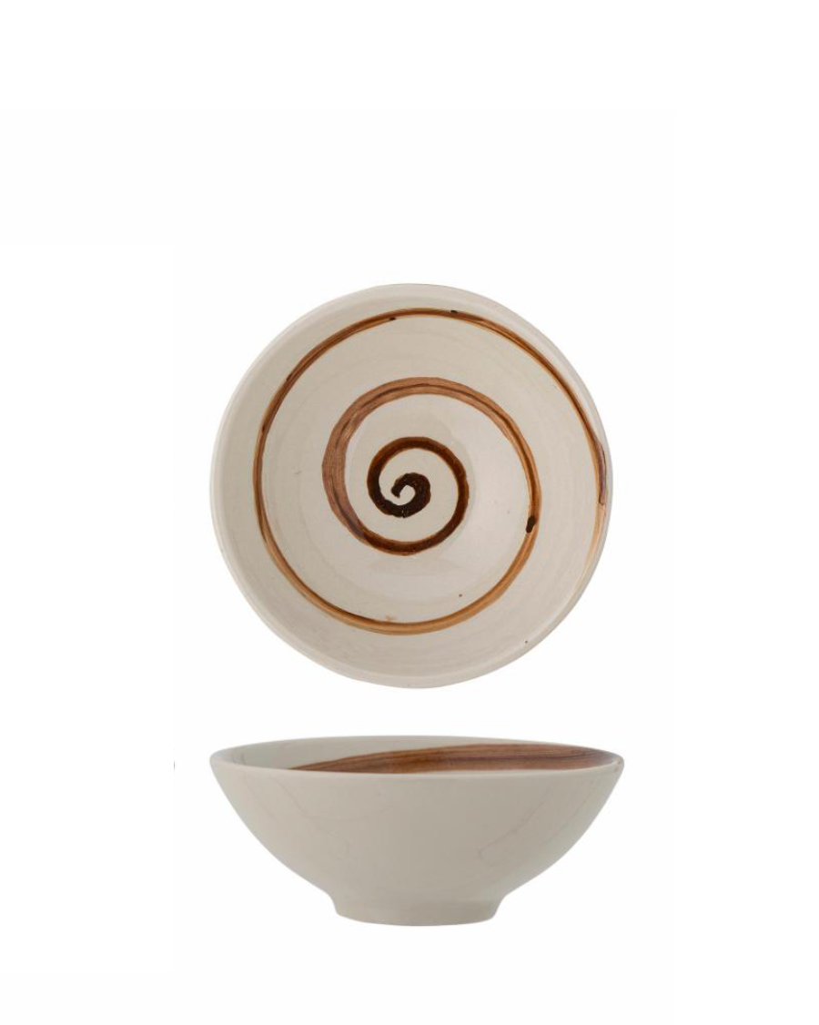 En nydelig småskål i steintøy med en varm beige farge og håndmalt brun spiral i midten. Perfekt til småretter, nøtter, sauser eller dessert, og gir et personlig preg på bordet med sin unike, håndmalte dekor. Skålen måler Ø12 x H4,5 cm og kan brukes alene eller i kombinasjon med andre skåler.