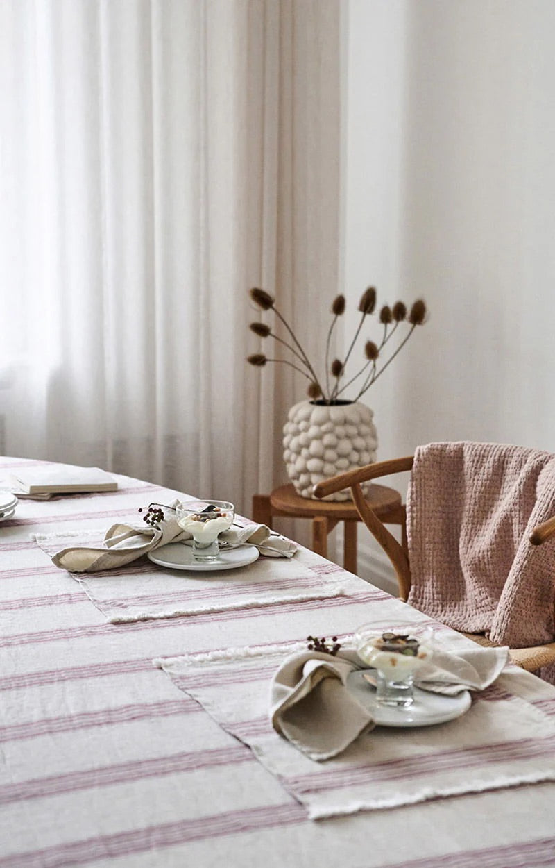 Gi bordet en avslappet og tidløs eleganse med Arles duk, laget i en raffinert blanding av 60 % bomull og 40 % lin. Den naturlige linteksturen og de lett falmede stripene gir dukens klassiske, men samtidig uformelle uttrykk, mens den lette krøllede effekten skaper en varm og innbydende følelse. Dukens garment-washede finish gjør at den faller naturlig og er perfekt for både hverdagslige måltider og mer avslappede selskaper.
