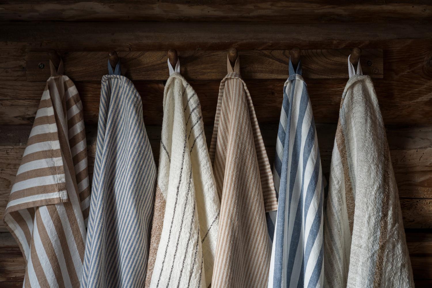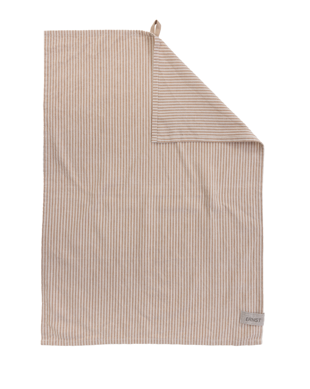Vakre kjøkkenhåndkler fra Ernst. Delikat kjøkkenhåndkle i naturfarget bomull med karamellfargede striper. Dette kjøkkenhåndkle vil vi ha over nystekte rundstykker eller slengt over skulderen i grillsesongen.