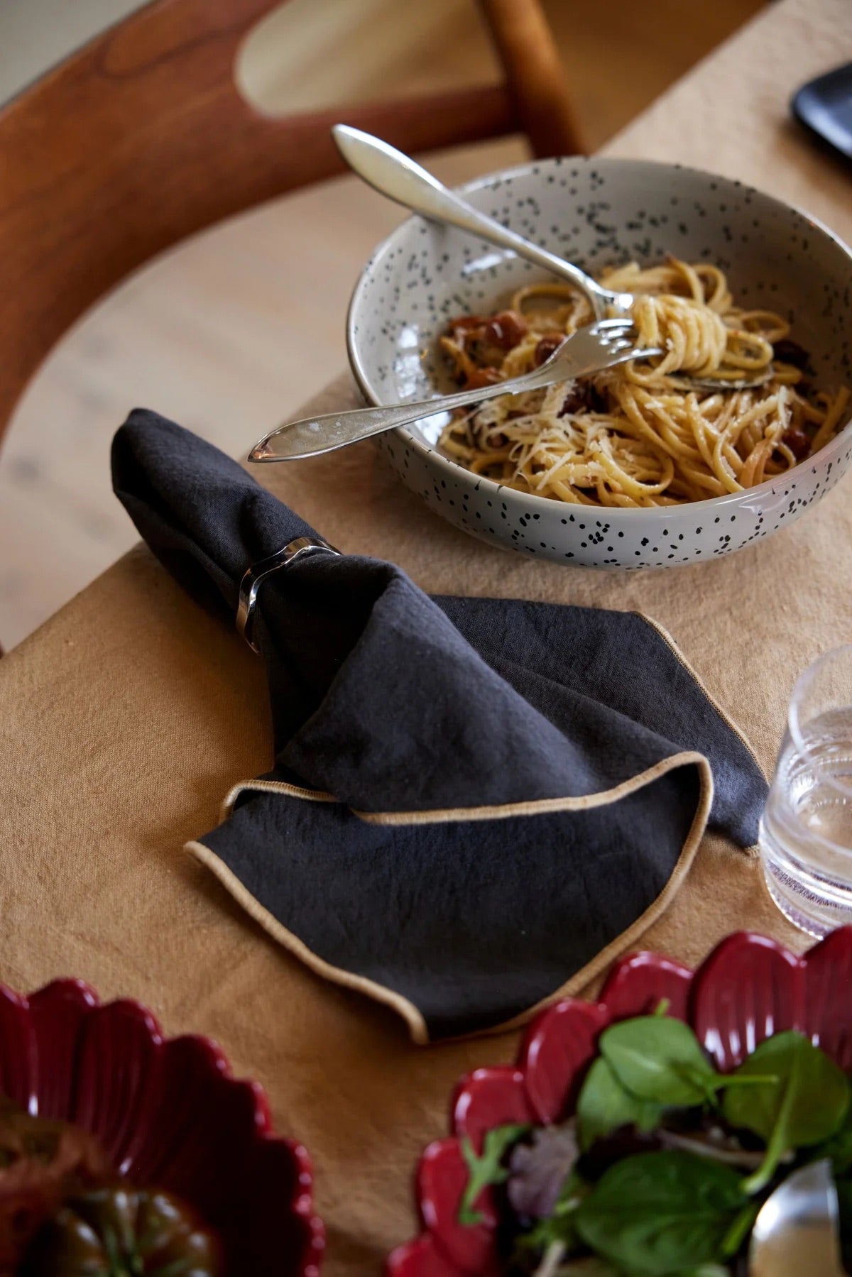 Edith serviett er en klassiker som skaper en varm og innbydende stemning rundt bordet. Den dekorative kontrastkanten tilfører et elegant detaljspill og løfter helhetsinntrykket, enten til hverdagsmiddagen eller festlige anledninger. Servietten har en myk og behagelig kvalitet som gjør den like praktisk som vakker.
