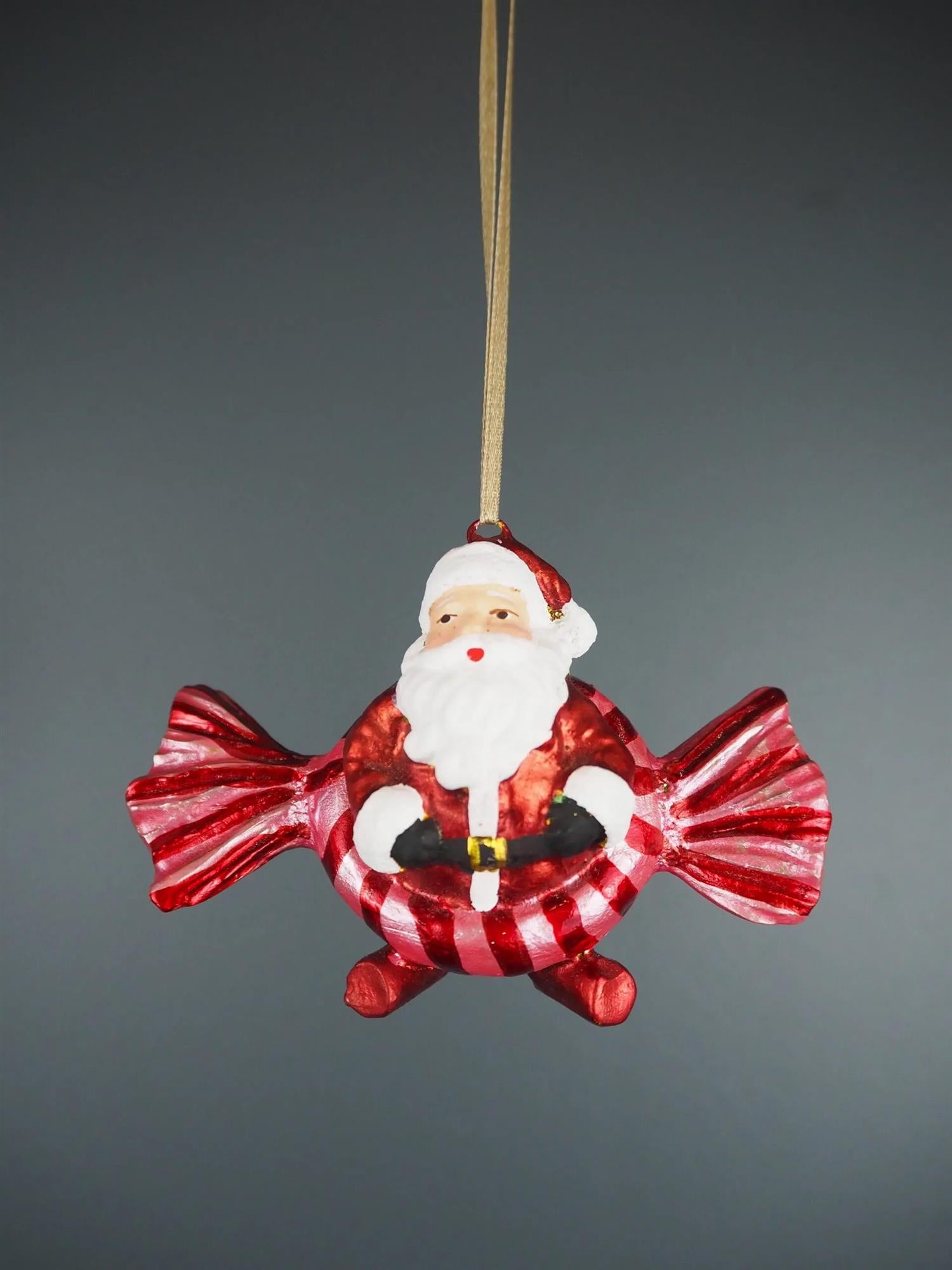 En skjønn, liten julenisse inni et rødt sukkertøy. Nissen er kledd i en klassisk, rød drakt med rosa, fluffy detaljer.