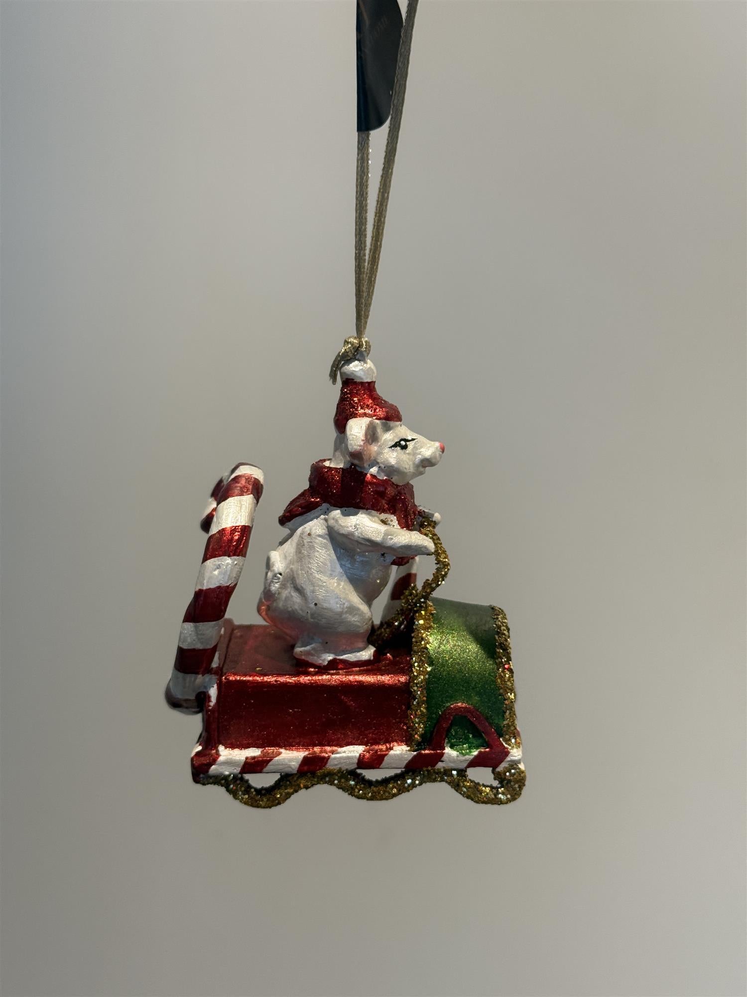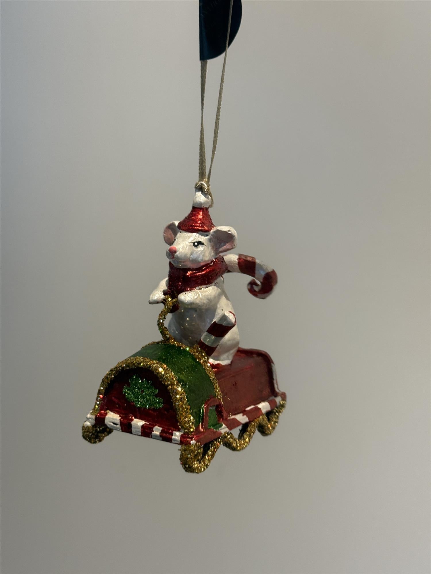 Karnivalmus på juleslede. Klar for å suse avgårde gjennom vintereventyret. En liten mus med rød lue og glitrende detaljer.