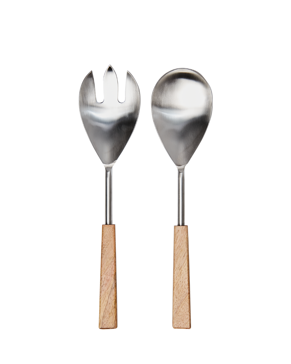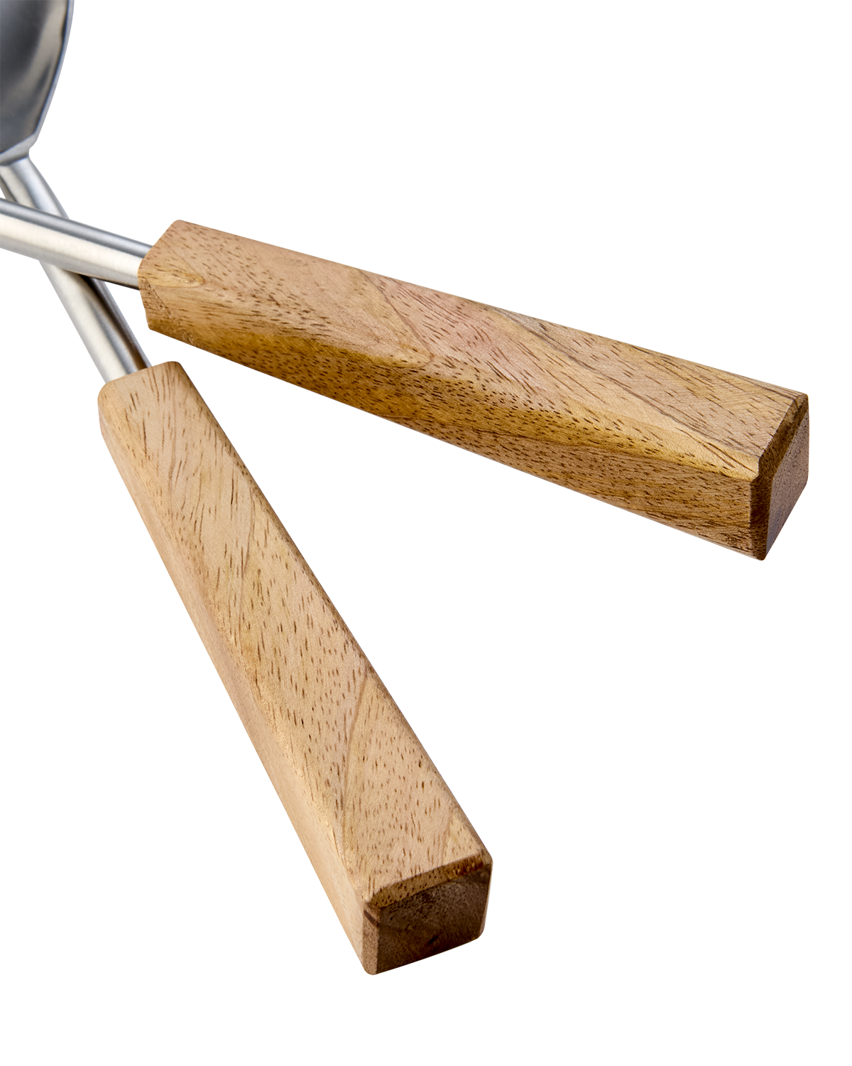 Nico salatbestikk kombinerer naturlig mangotre med sølvfarget rustfritt stål – en elegant balanse mellom rustikt og moderne design. Den harmoniske formen og glatte overflaten gjør dem behagelige å bruke, enten du serverer salater eller varme retter.