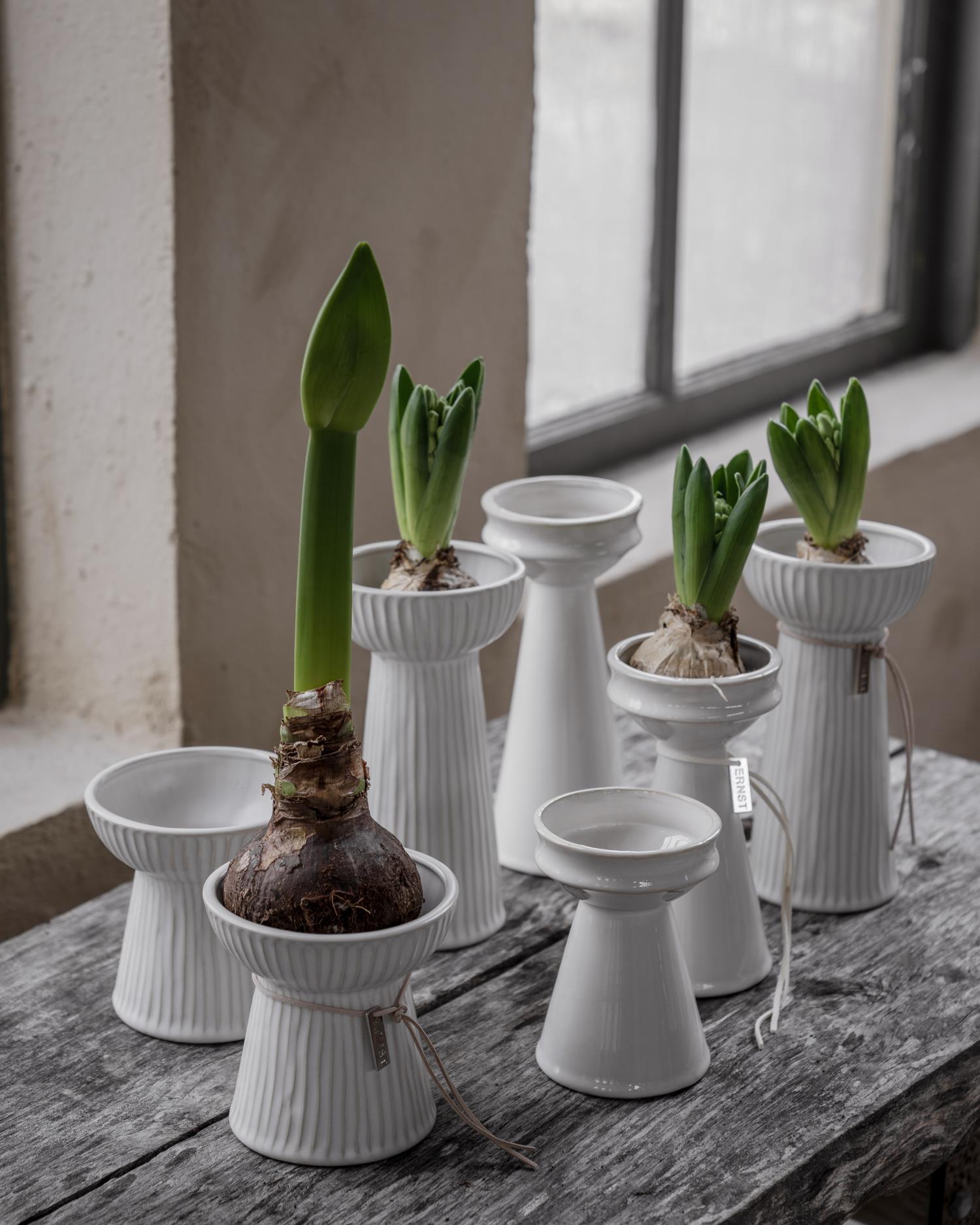 En stilren løkvase i naturhvit keramikk som passer perfekt til julens løkblomster. Den myke fargen og enkle formen skaper en rolig og harmonisk atmosfære – like fin til julens svibler som til friske vårblomster.