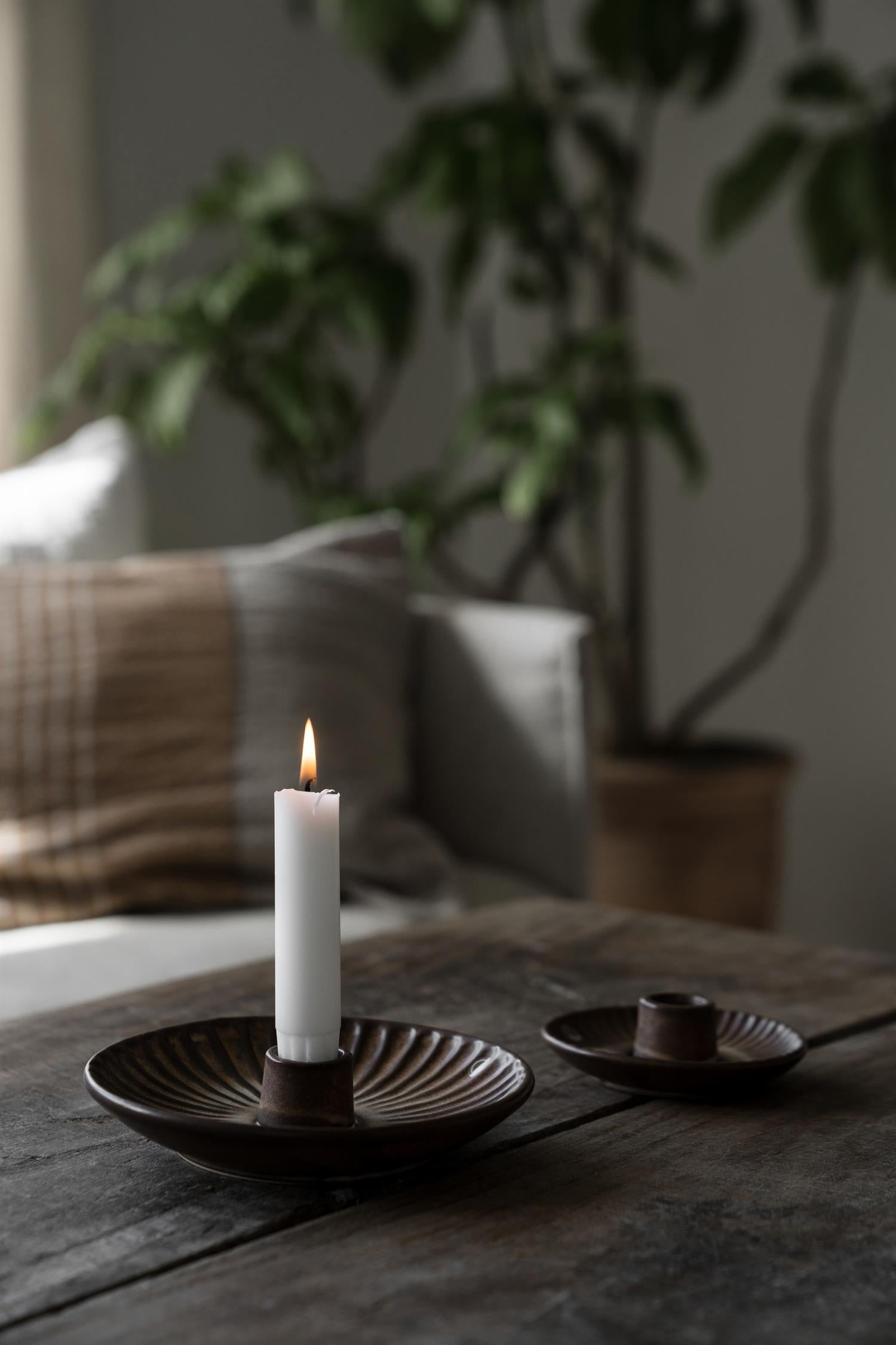 En stilren lysestake i glasert steingods som sprer en lun og rolig stemning. Den myke fargekombinasjonen av brun og beige gjør den enkel å kombinere med ulike interiørstiler og passer like godt på spisebordet som i vinduskarmen.