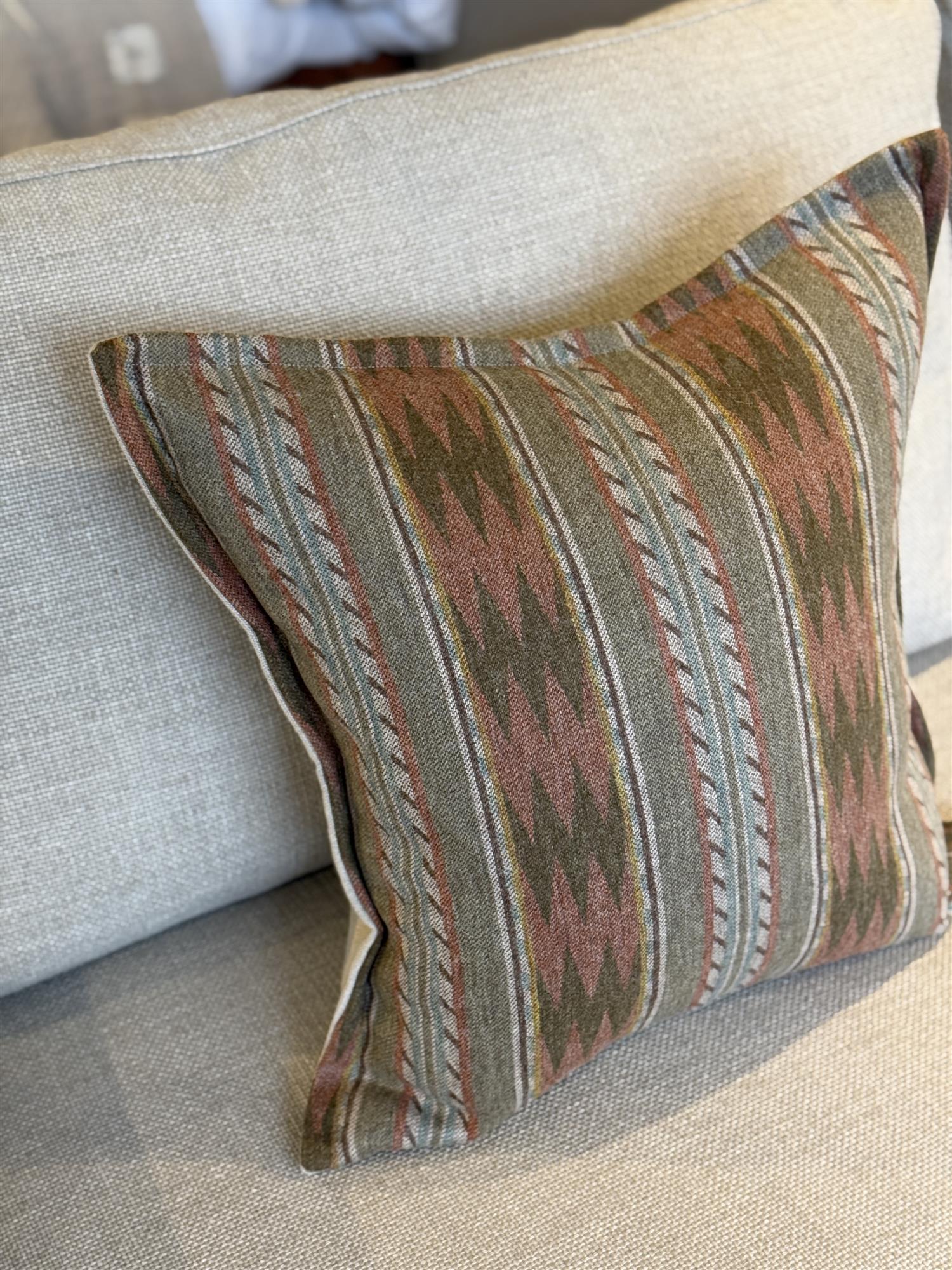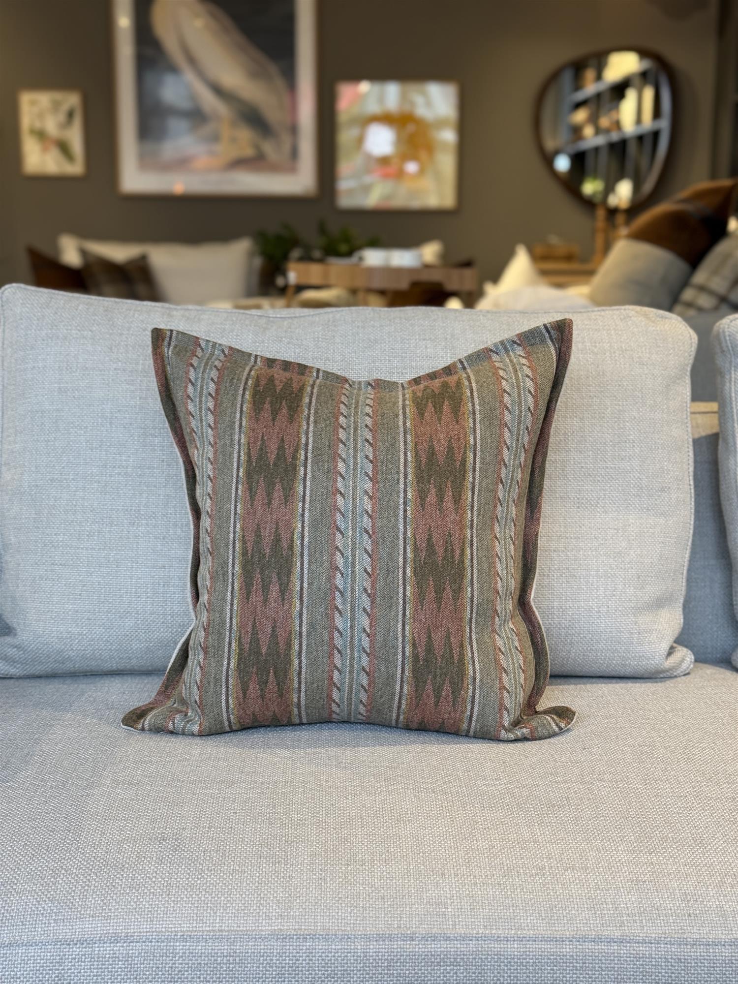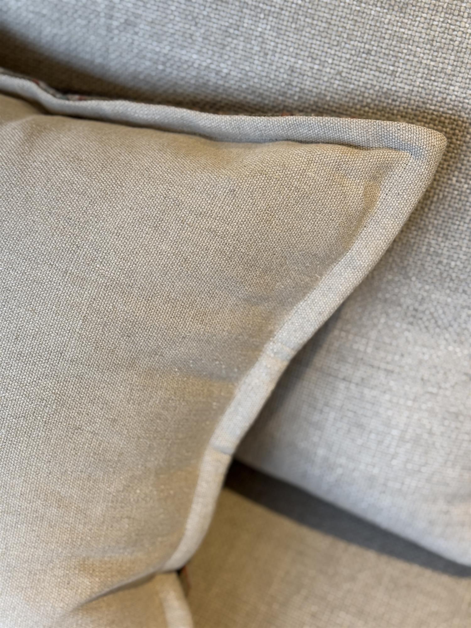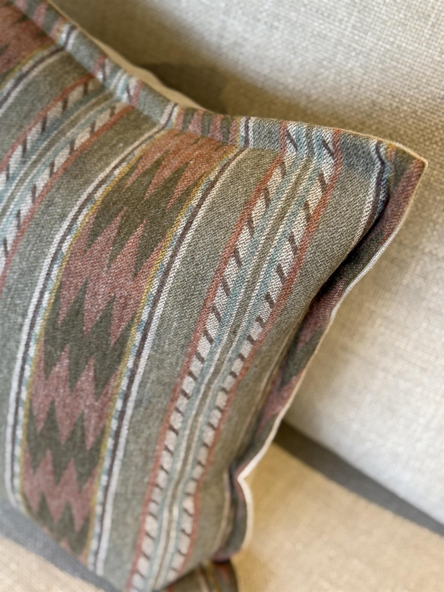 Denne eksklusive pynteputen fra W22s egen kolleksjon kombinerer håndverk og klassiske tekstiler i en elegant og tidløs design. Forsiden er sydd i et Mulberry-tekstil med rustikke, vevde mønstre i grønne, rustrøde og sandfargede toner, mens baksiden er i Inzimi fra Nevotex – et mykt lintekstil som gir et rolig og harmonisk uttrykk.