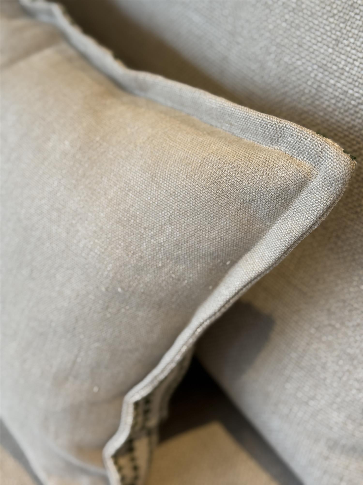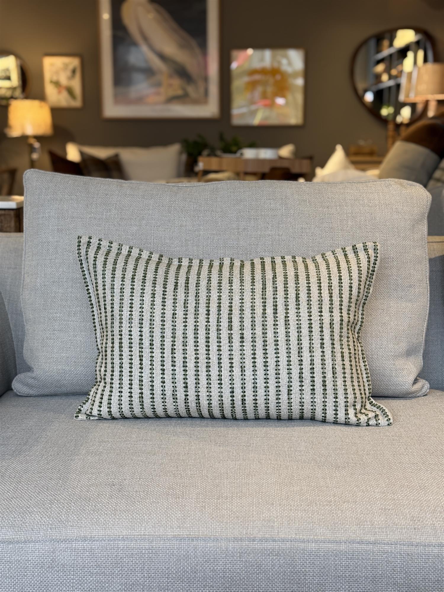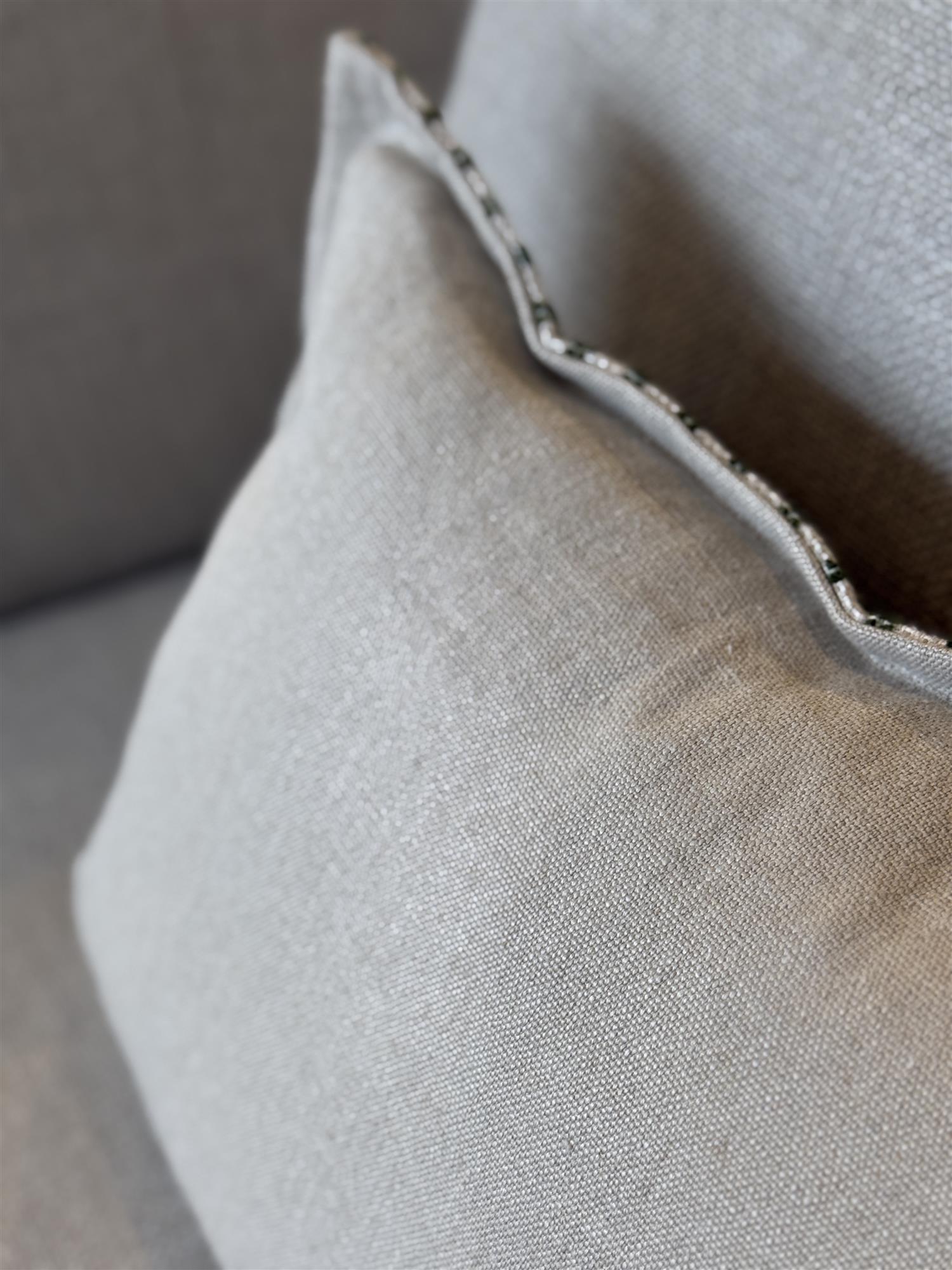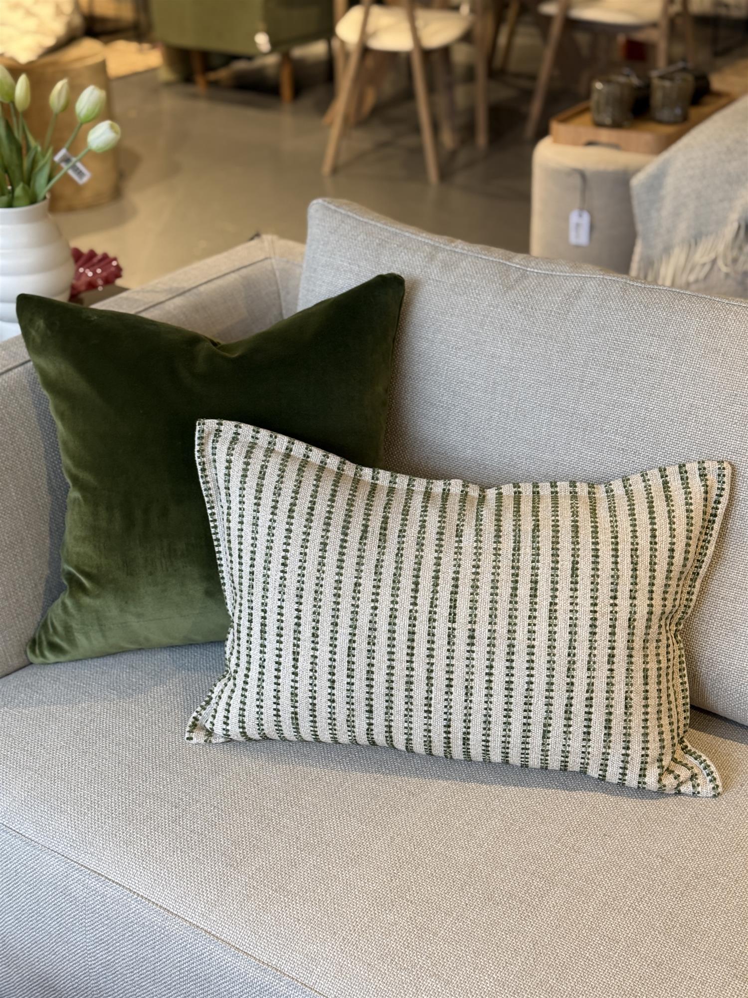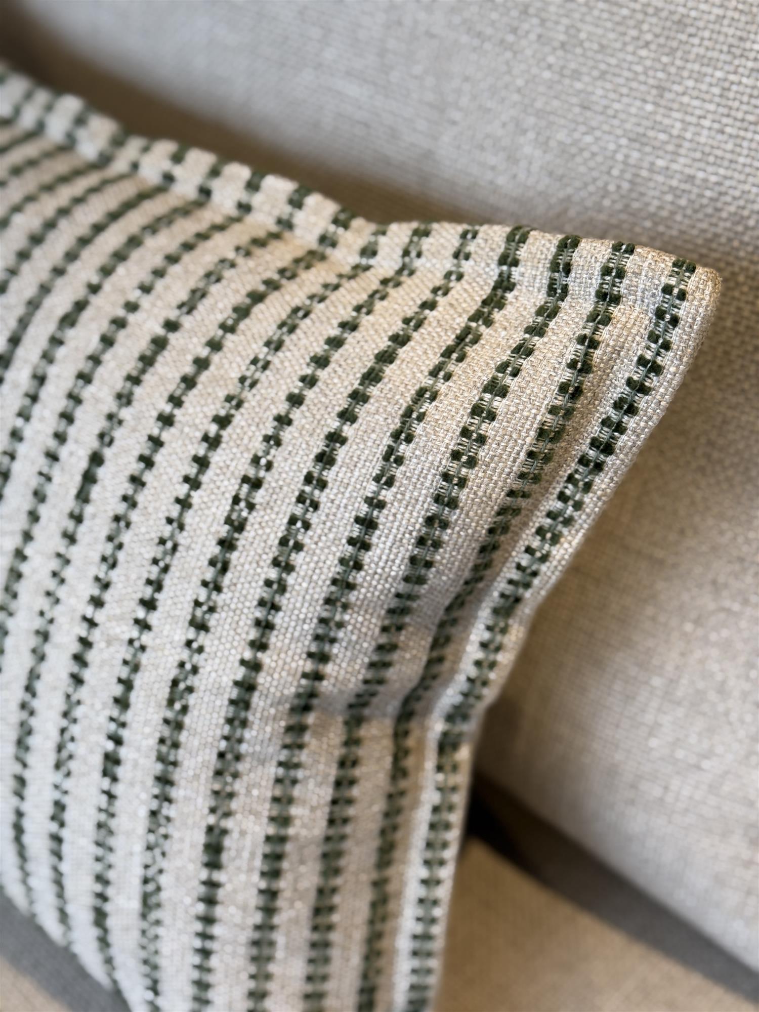 Tidløs pyntepute fra W22s egen kolleksjon, sydd i Oslo med fokus på kvalitet og detaljer. Forsiden er i tekstilet Riley Green – et strukturert stoff med vevde striper i grønne og naturtoner som gir et friskt, moderne uttrykk. Baksiden er i Inzimi fra Nevotex, et mykt lintekstil som tilfører ro og balanse.
