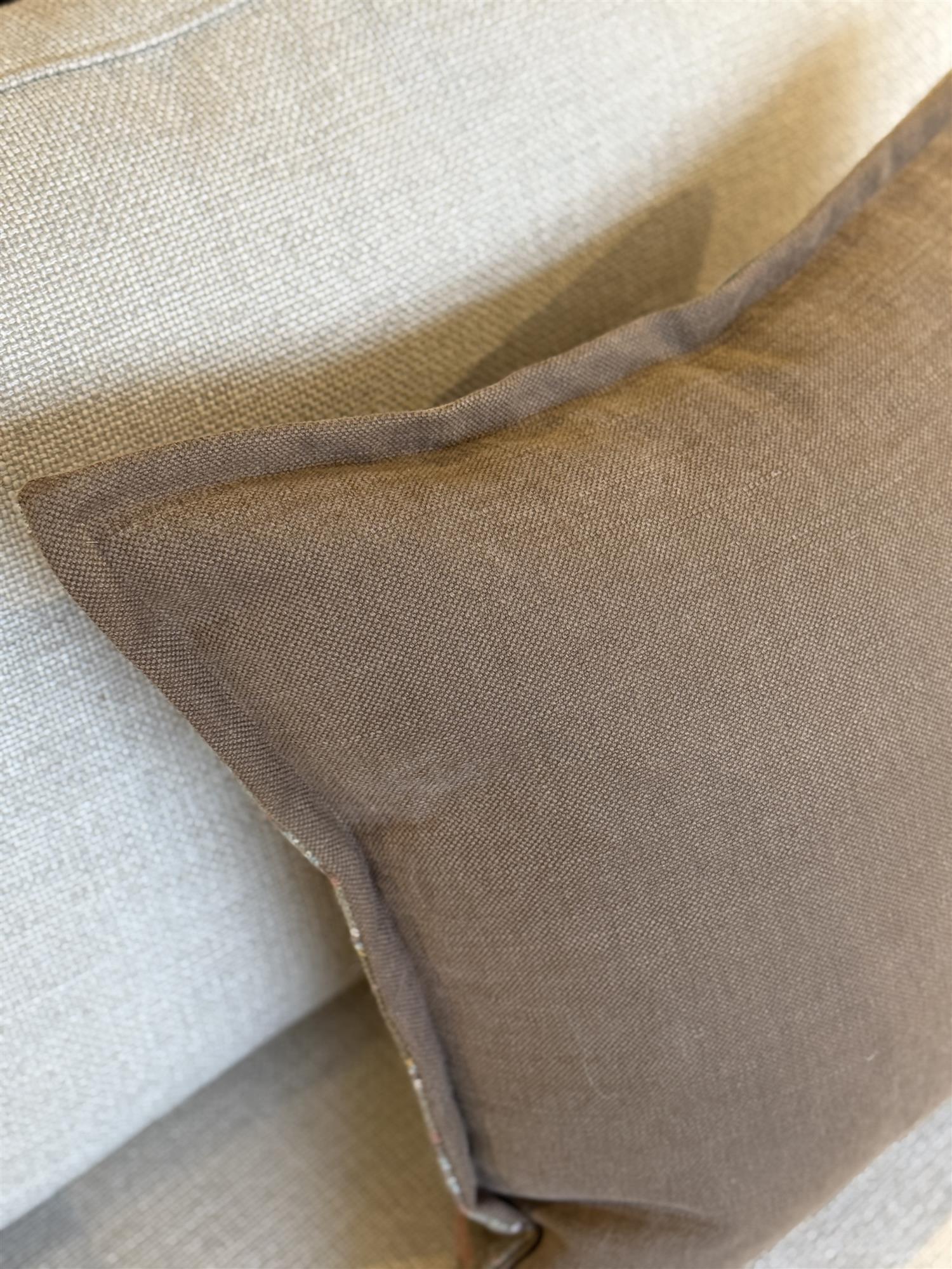 Denne håndsydde pynteputen fra W22s egen kolleksjon kombinerer klassisk design med naturlige materialer i varme, jordnære toner. Forsiden er laget i et Mulberry-tekstil med rustikt mønster i grønne, rustrøde og duse blågrå nyanser, mens baksiden er i Caleido fra Nevotex – et mykt bomull- og linblandingsstoff som tilfører et rent og harmonisk uttrykk.
