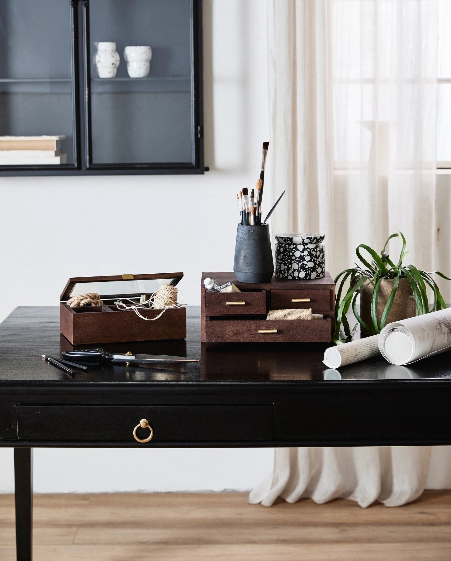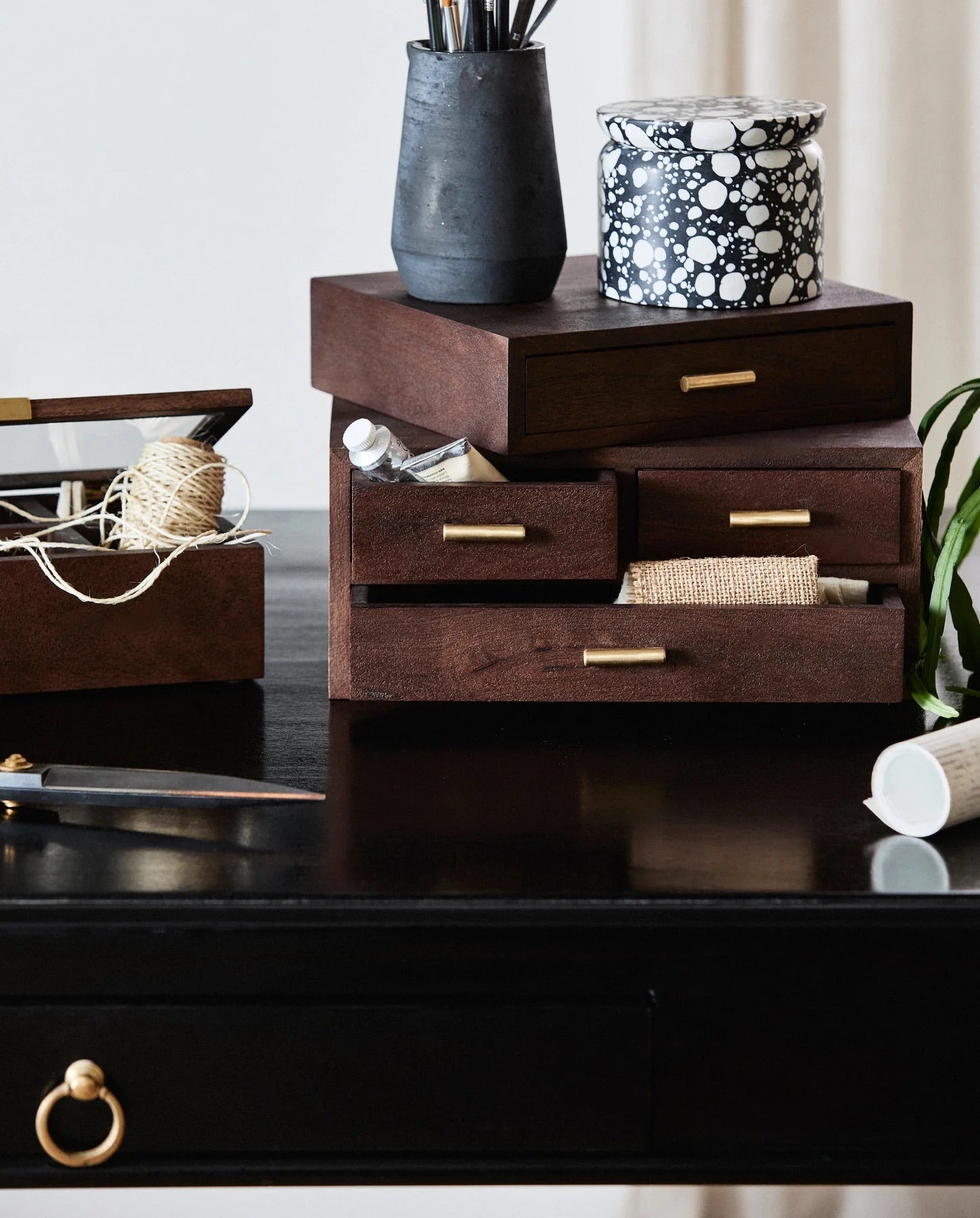 Suva er en elegant oppbevaringsløsning med en enkel skuff i mørkbeiset mangotre og et håndtak i messingfarge. Perfekt å plassere på bord eller i skap, og ideell for småting som smykker, kunstnermateriell, blyanter eller andre små gjenstander. Det naturlige mangotreet gir hver enhet et unikt utseende med små variasjoner i farge og struktur.