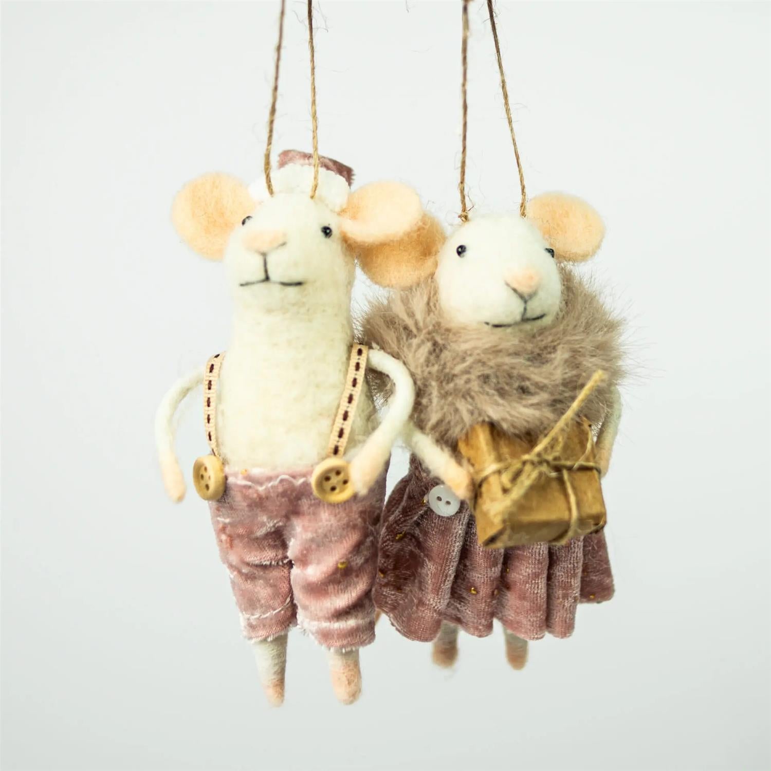 Hvit partymus med rosa kjole med pelskrage og pakke.