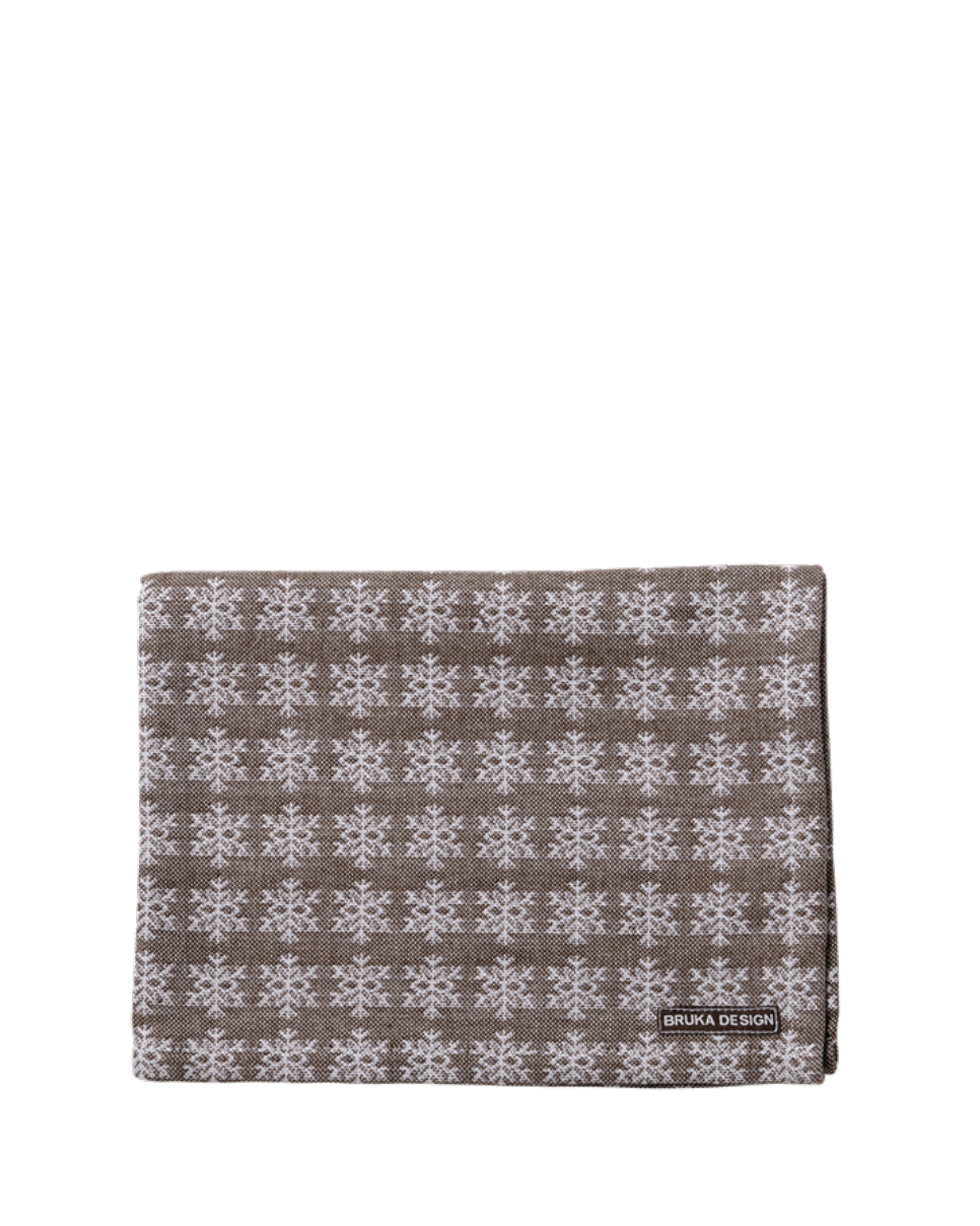 Et stilrent kjøkkenhåndkle i brunt med hvite snøfnugg fra Bruka Design. Det vinterlige mønsteret skaper en lun og stemningsfull følelse på kjøkkenet, perfekt til både hverdag og jul.