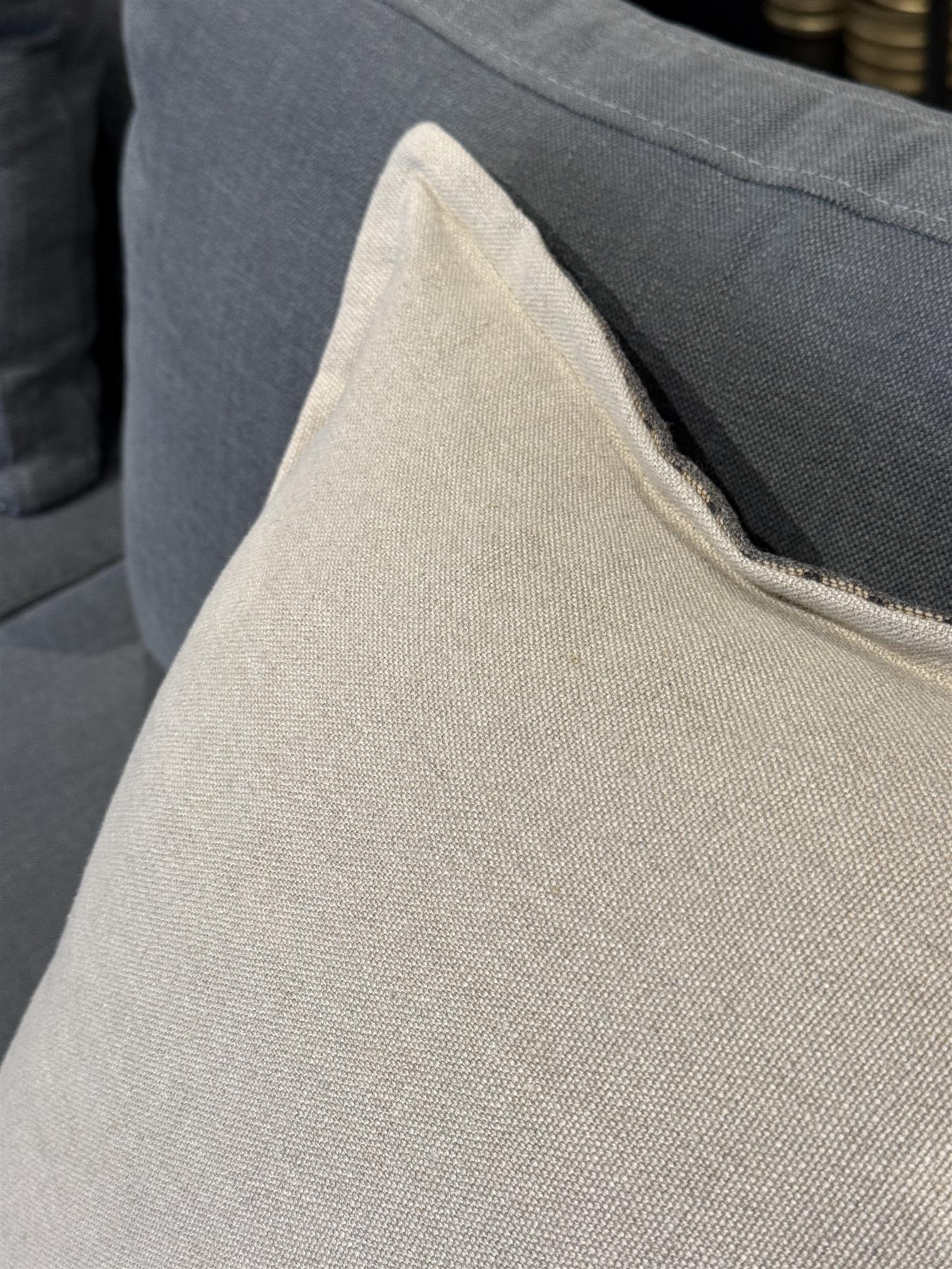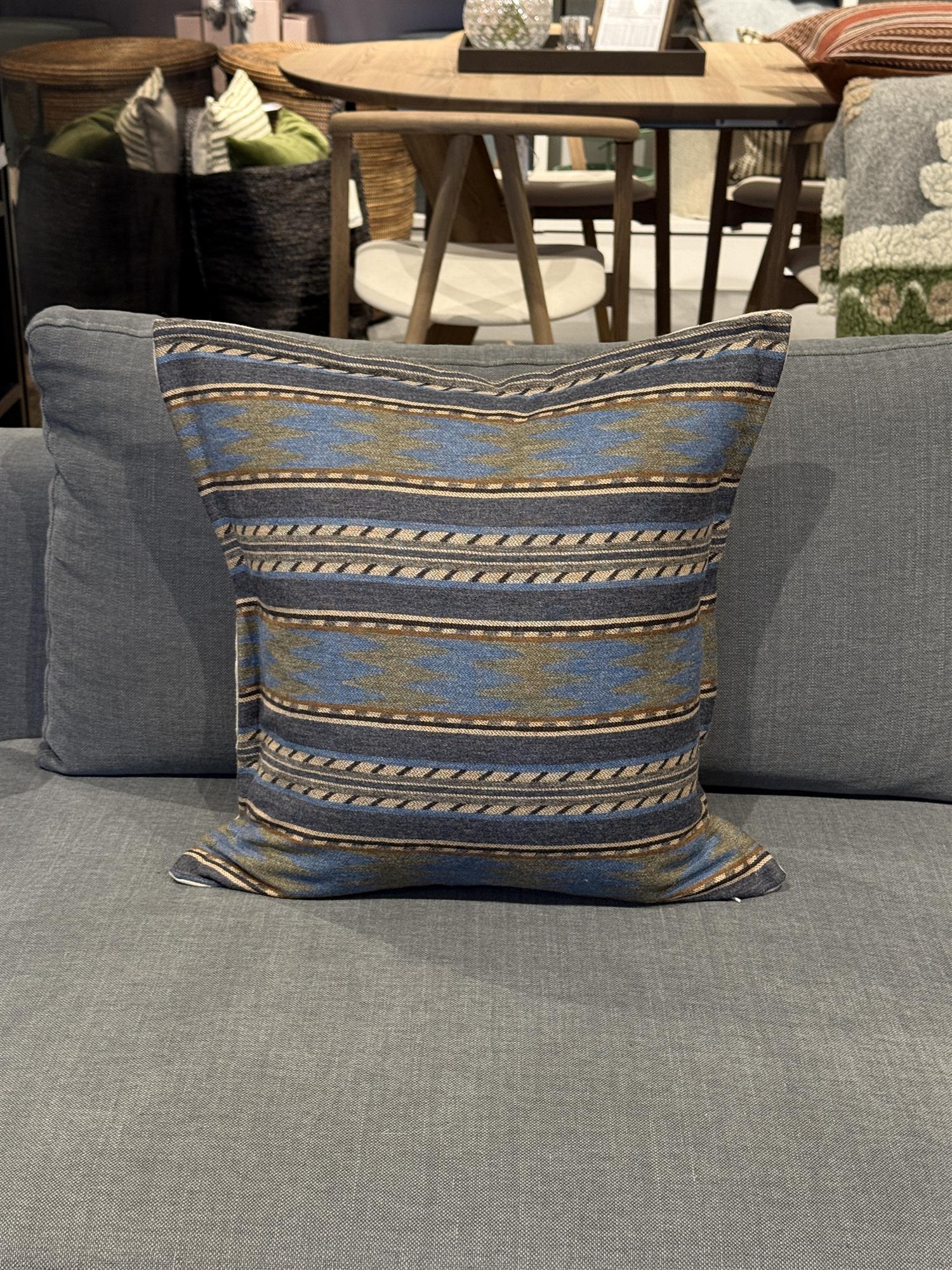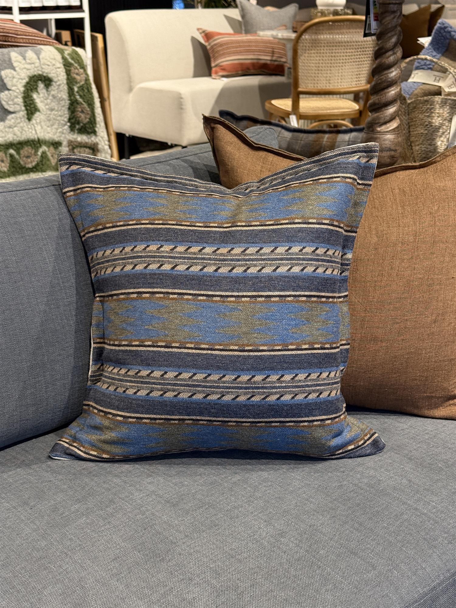 Denne håndsydde pynteputen fra W22s egen kolleksjon kombinerer tekstiler av høyeste kvalitet for et unikt og tidløst uttrykk. Forsiden er sydd i Mulberrys eksklusive tekstil i blått med varme nyanser og karakter. Baksiden er i Inzimi fra Nevotex, et mykt og naturlig lintekstil som tilfører ro og balanse til designet.