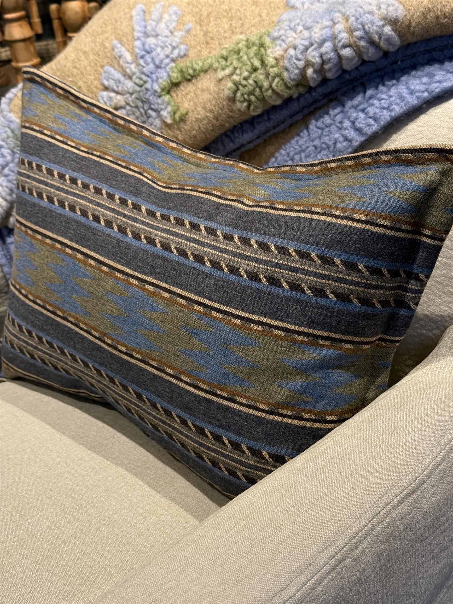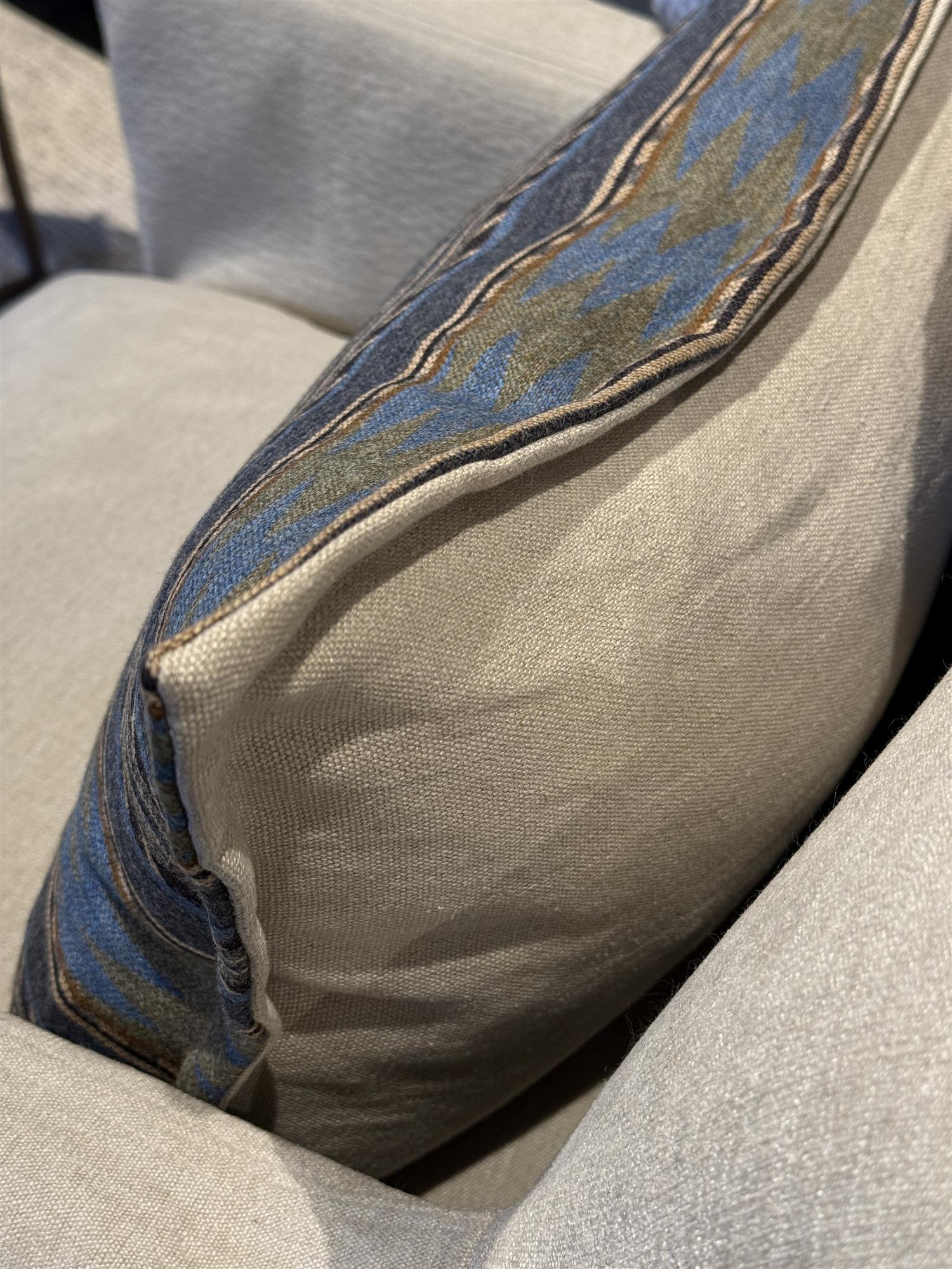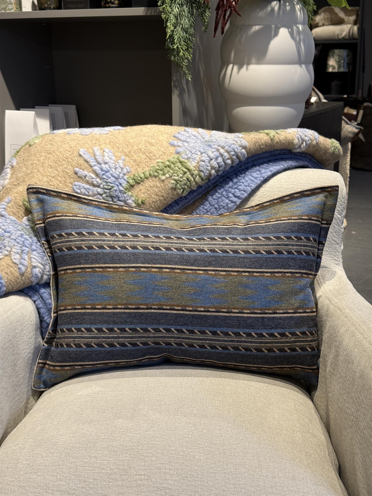 Denne håndsydde pynteputen fra W22s egen kolleksjon kombinerer tekstiler av høyeste kvalitet for et unikt og tidløst uttrykk. Forsiden er sydd i Mulberrys eksklusive tekstil i blått med varme nyanser og karakter. Baksiden er i Inzimi fra Nevotex, et mykt og naturlig lintekstil som tilfører ro og balanse til designet.