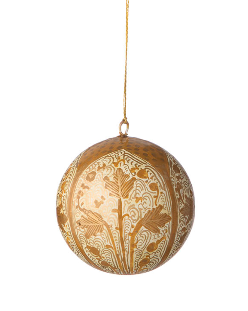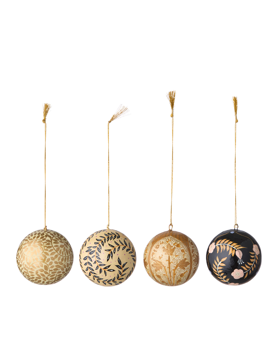 Disse vakre Gaya julekulene er håndmalt i India, noe som gir hver kule sitt helt unike uttrykk og sjarm. Laget i papir-maché og dekorert i gull, tilfører de et stemningsfullt og håndverksmessig preg til juletreet eller julepynten din.