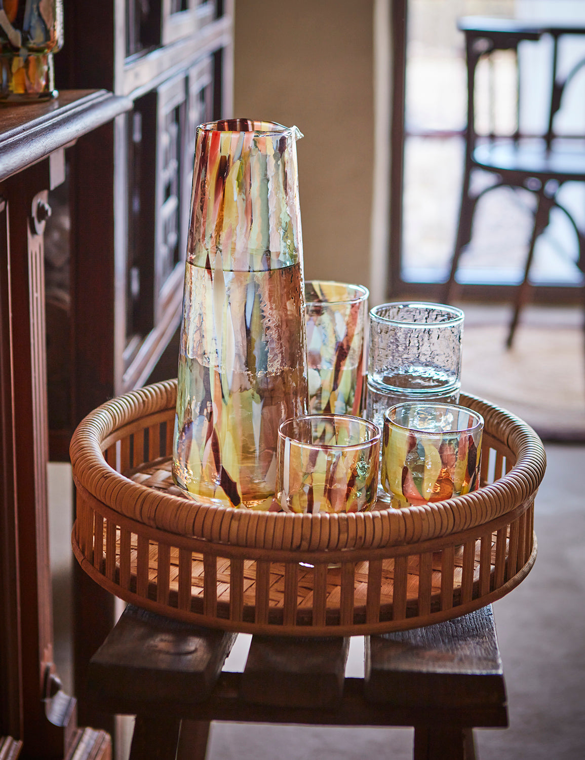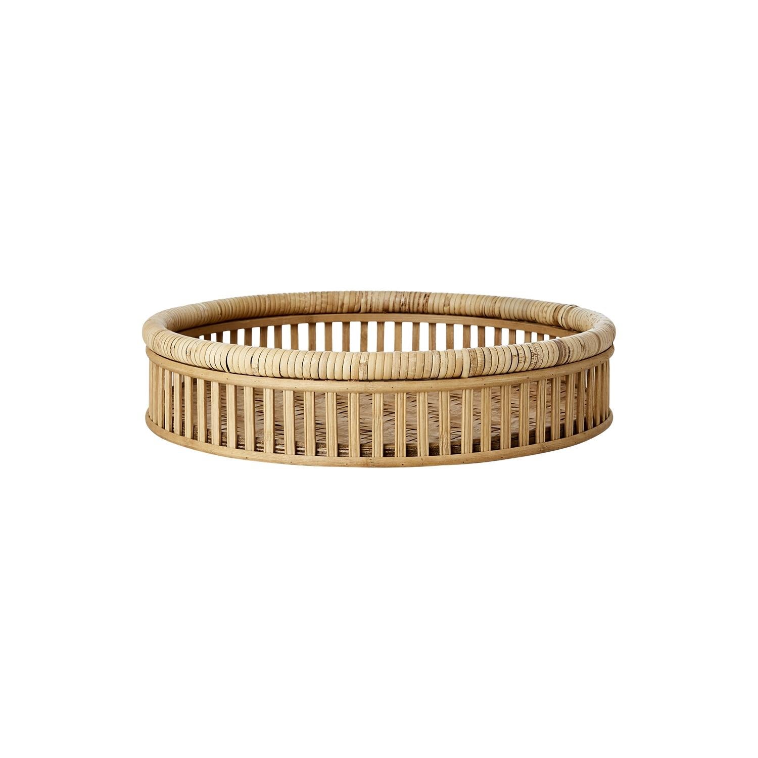 Et allsidig mellomstort brett i bambus og rotting som balanserer funksjon og estetikk på en elegant måte. Perfekt til servering, stilleben eller som samlende element på benk eller bord.