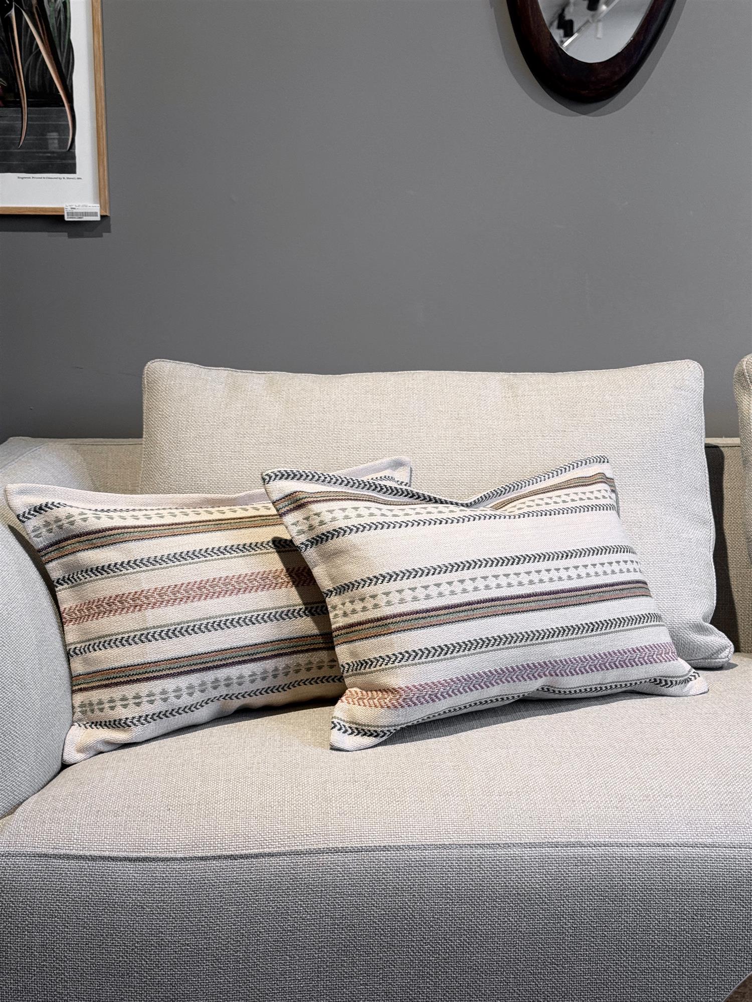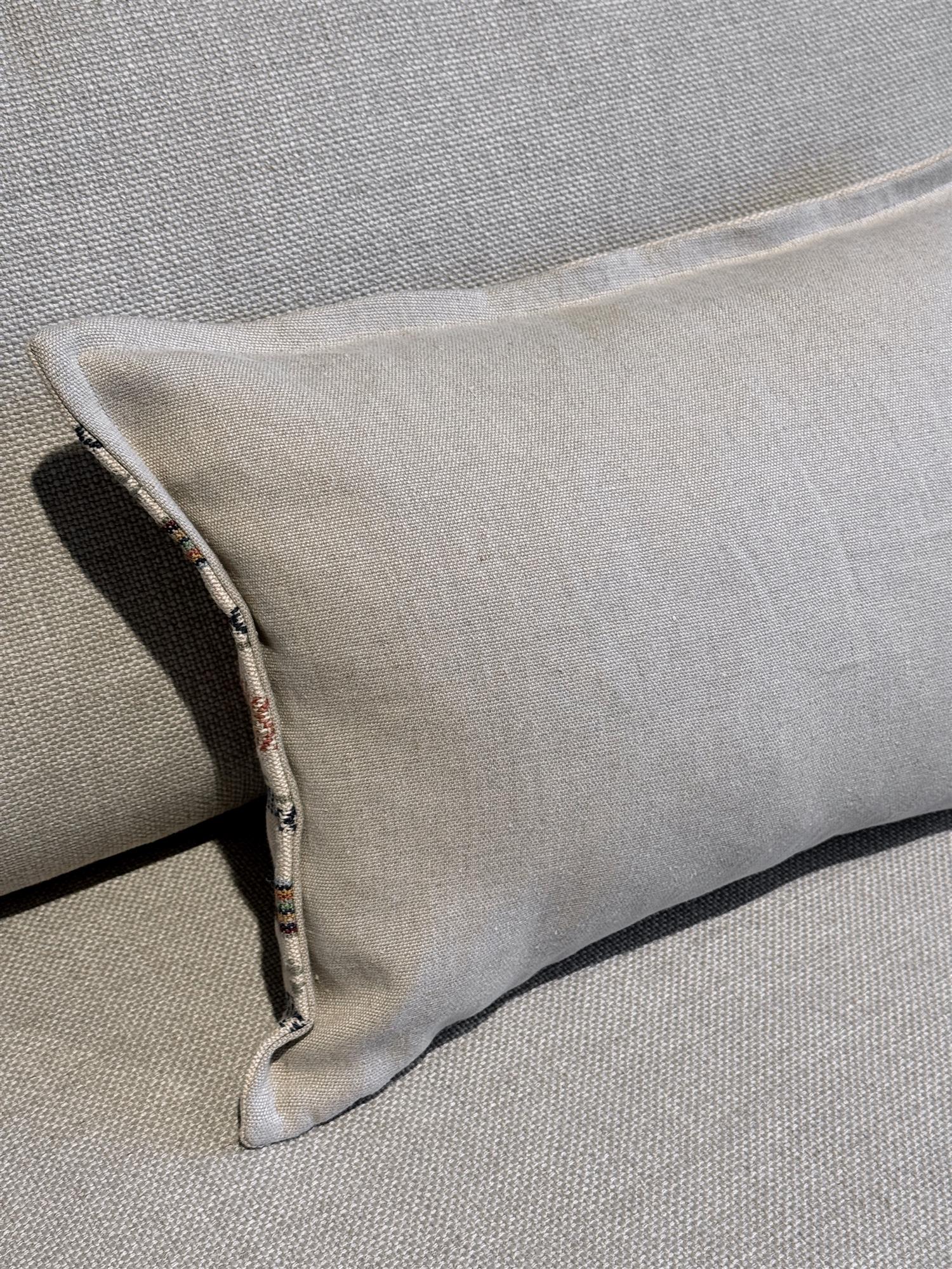 – et strukturert stoff med nyanser i natur, rosa og denim og karakter. Baksiden er i Inzimi fra Nevotex, et mykt og naturlig lintekstil som tilfører ro og balanse til designet.