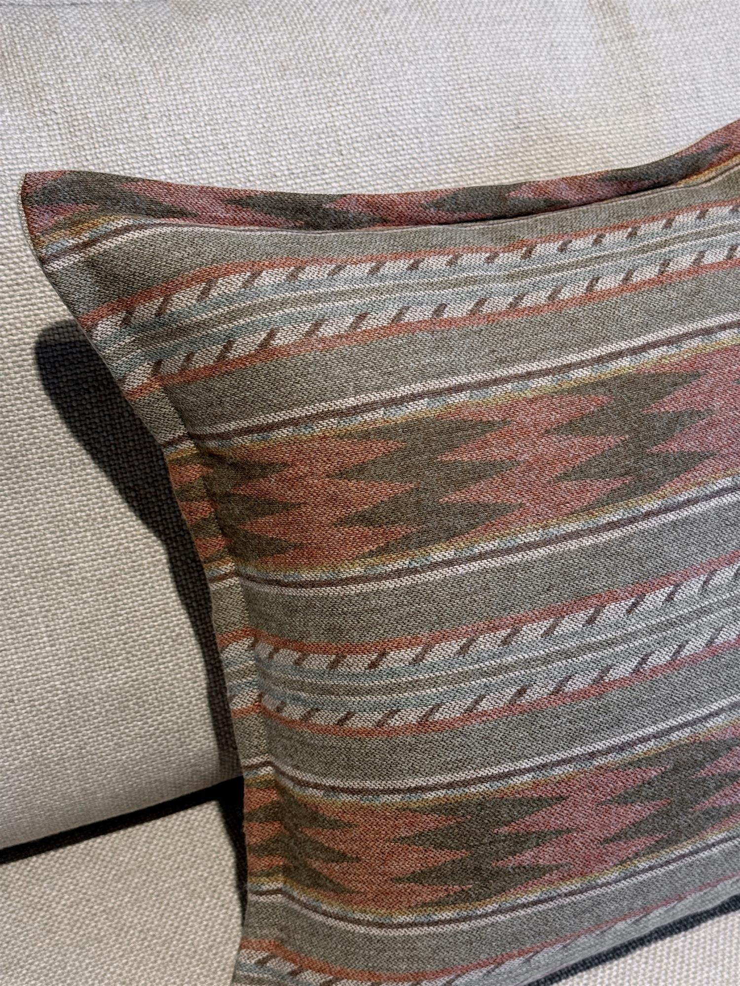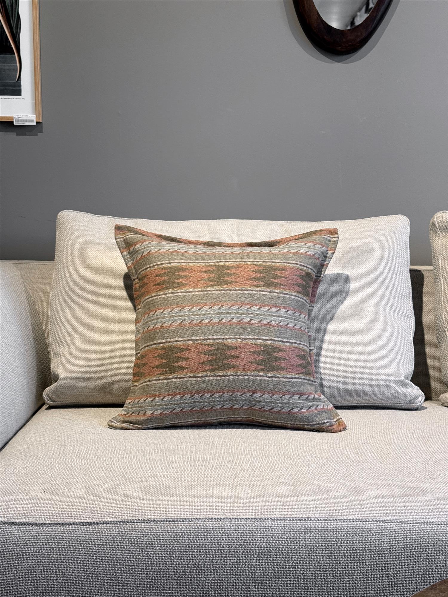 Denne håndsydde pynteputen fra W22s egen kolleksjon kombinerer klassisk design med naturlige materialer i varme, jordnære toner. Forsiden er laget i et Mulberry-tekstil med rustikt mønster i grønne, rustrøde og duse blågrå nyanser, mens baksiden er i Inzimi natur fra Nevotex – et linstoff som tilfører et rent og harmonisk uttrykk.