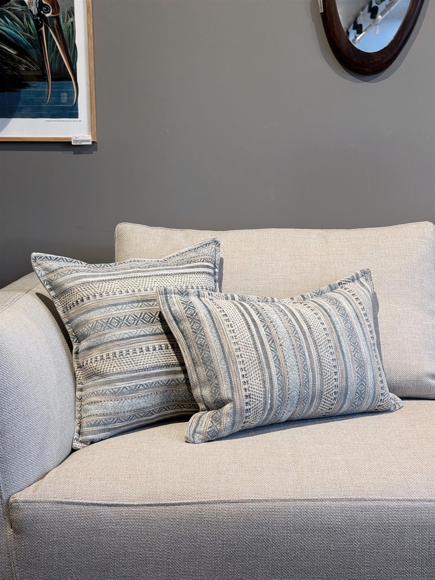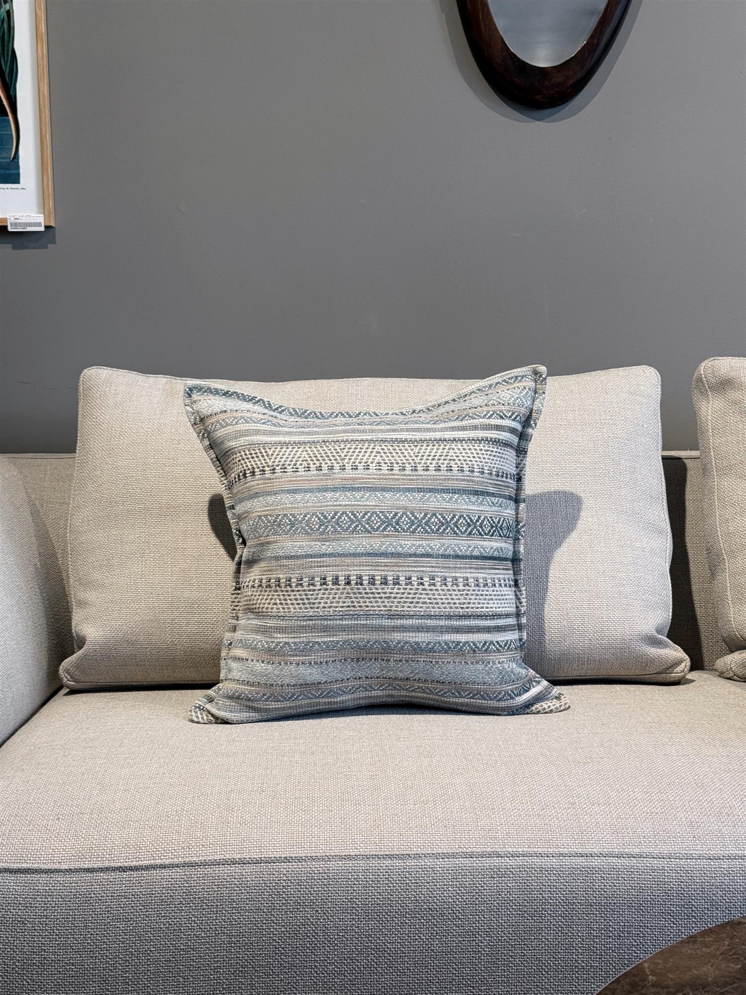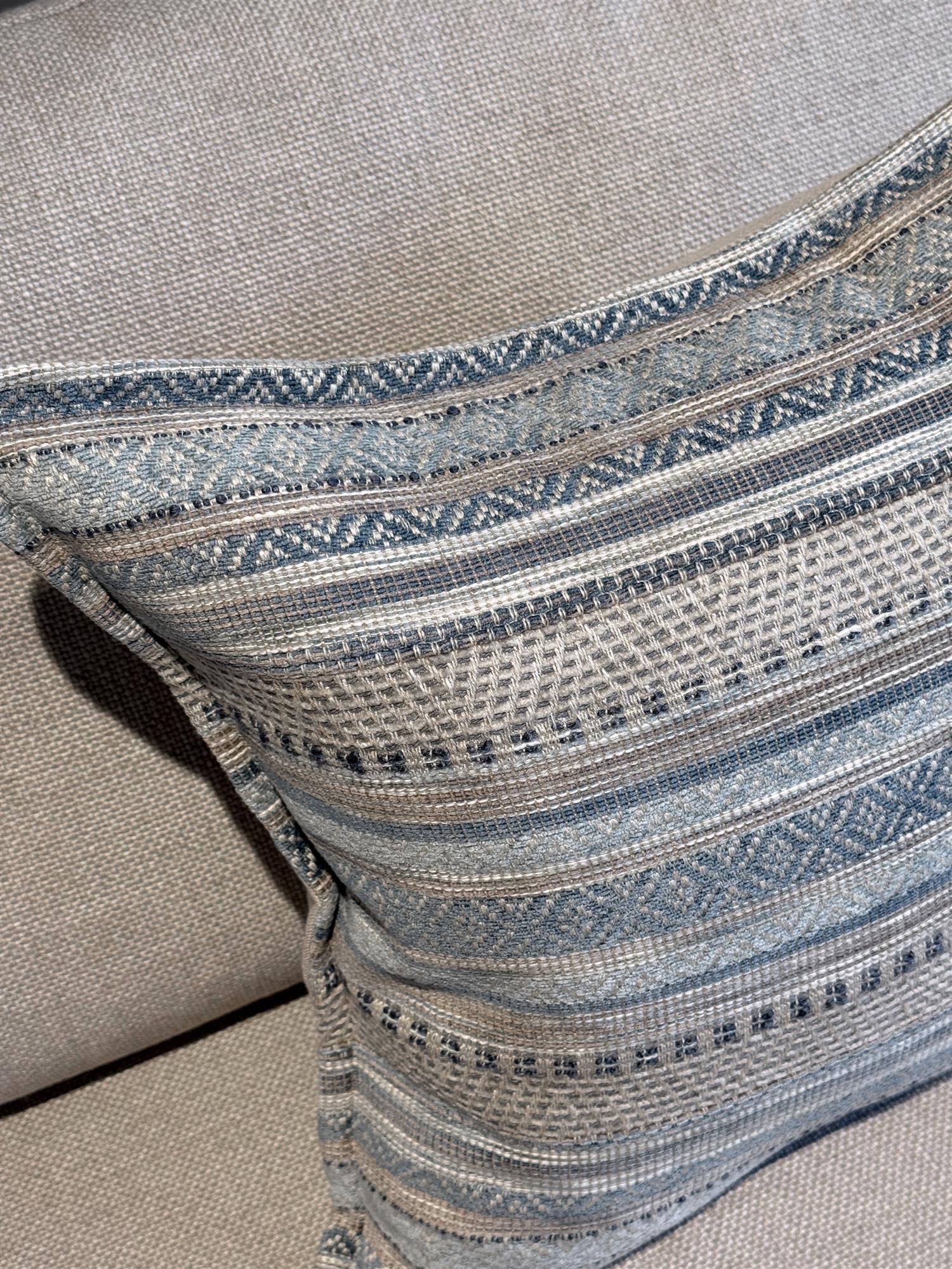 Håndsydd pute i kvalitets-møbeltekstil. Puten har en side med flerfarget, stripet mønster i blå og gyldne toner og en med Inzimi natur lin på baksiden. Puten måler 50x50 cm og har en dekorativ kantsøm rundt puten for et eksklusivt uttrykk.