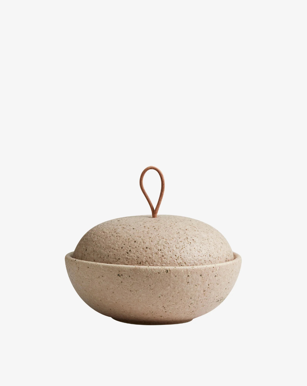 Lokket er utstyrt med en enkel skinnhempe som både er praktisk og dekorativ, og tilfører et varmt, taktilt element til keramikken. SANDY passer perfekt til oppbevaring av småting som smykker, nøkler, bomullspads eller krydder, men kan like gjerne brukes som en del av en stilleben-styling i stue, bad eller på kjøkkenet. Den lave høyden og runde formen gjør den også velegnet til servering av små snacks eller salt på bordet.