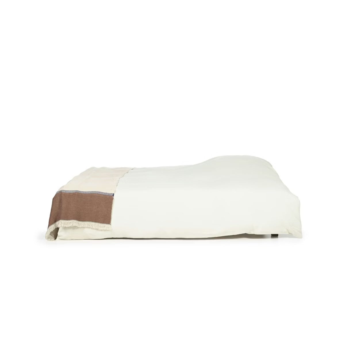 Utformingen gjør overkastet svært allsidig: bruk det som et lett sengeteppe, drapert over en sofa eller daybed, eller som en dekorativ tekstil over spisebordet eller en benk. De rå selvedge-kantene langs sidene og den diskrete frynsen øverst og nederst gir et avslappet, håndverksmessig preg som fremhever materialets naturlige skjønnhet.