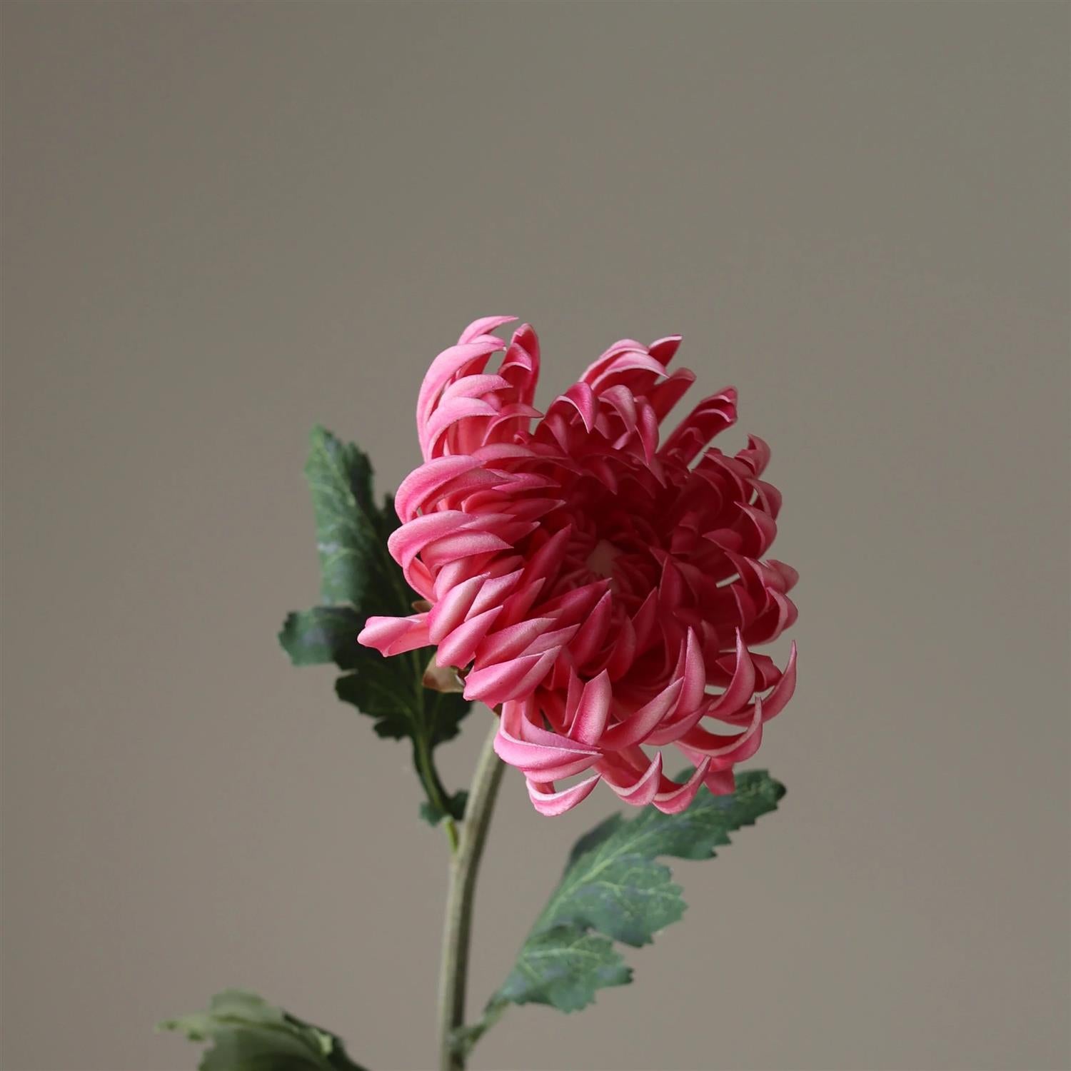 Denne kunstige Dahlia-blomsten har delikat krøllete kronblader i en frisk rosa nyanse, og skaper en strukturert og dekorativ blomsteroppsats. Den slanke, lett strukturerte stilken har en dempet grønn tone og måler 60 cm i høyden, og er ledsaget av brede, dypt lappede blader med matt overflate.