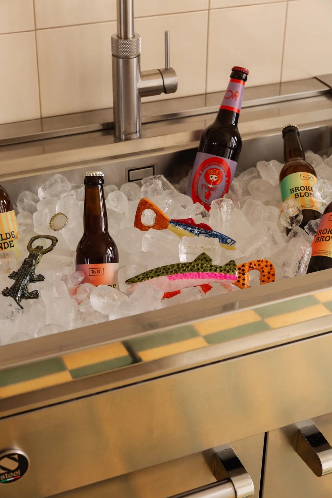 En leken og dekorativ flaskeåpner formet som en alligator – like praktisk som den er iøynefallende. Den detaljerte overflaten og organiske formen gir et nesten håndlaget uttrykk, og gjør den til et lite samtaleobjekt enten den ligger på kjøkkenbenken, ved barvognen eller ute på sommerbordet.