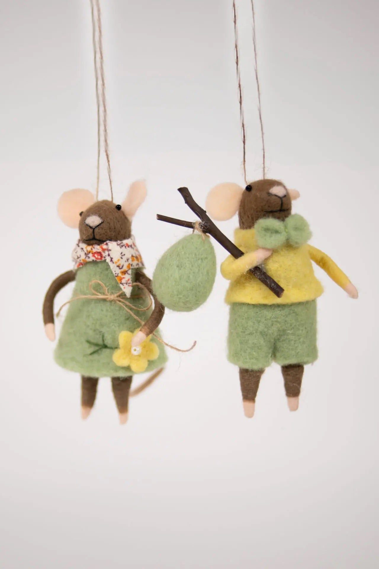 En håndlaget påskemus i myk syntetisk ull med grønn bukse, gul genser og sløyfe. Musen holder en liten kvist og et grønt egg – en fin referanse til vårens og påskens symboler.