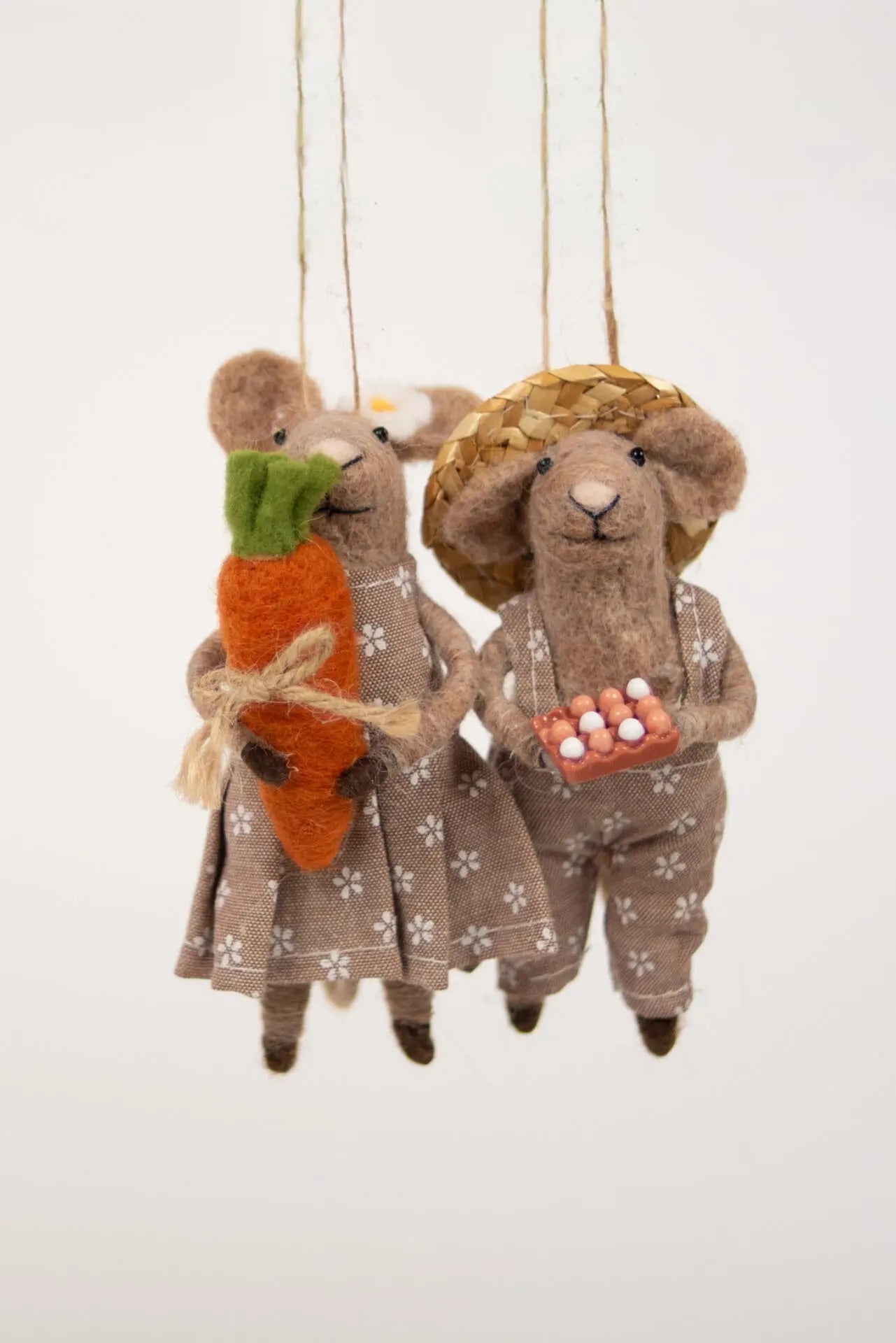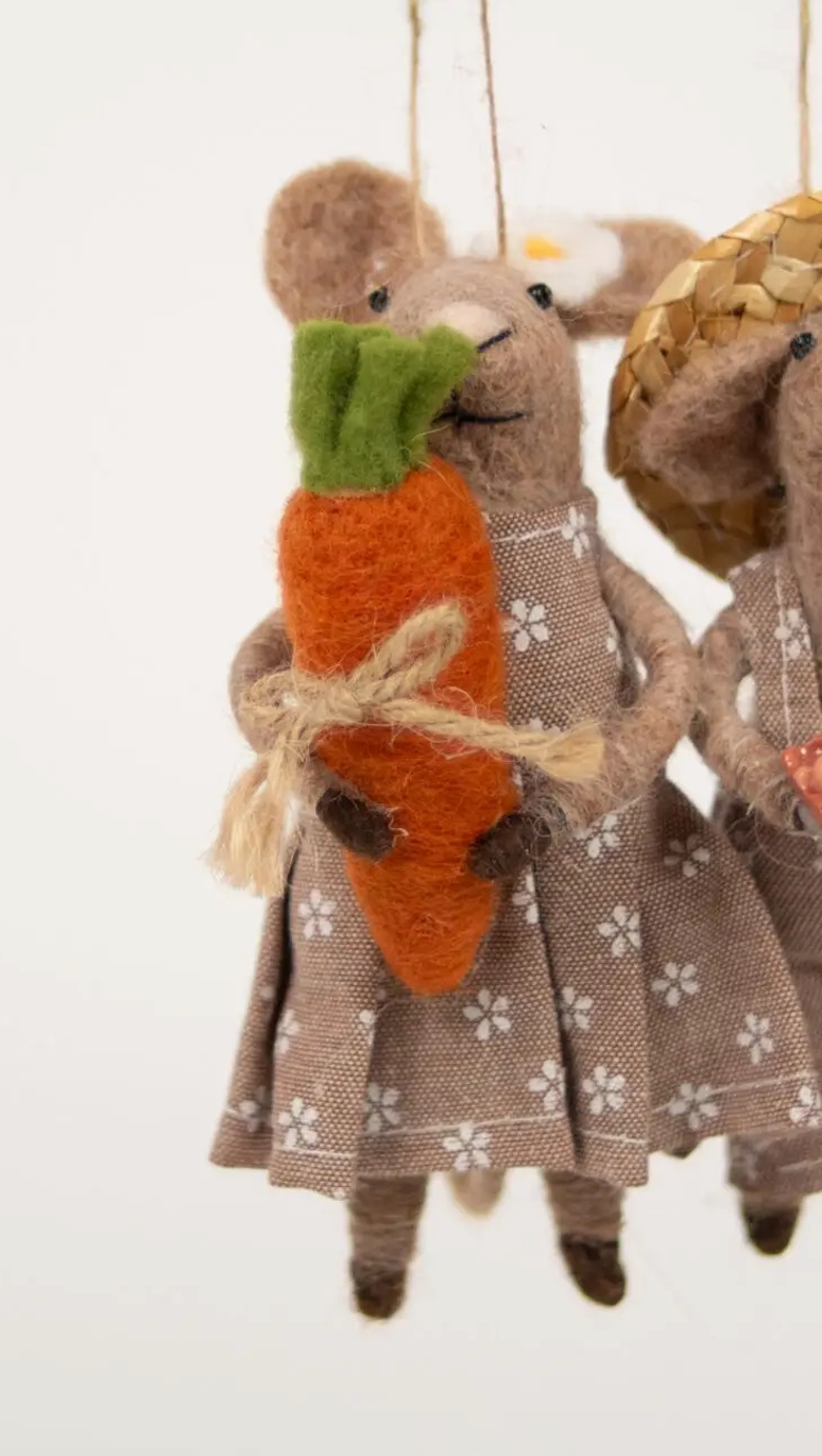 En håndlaget påskemus i myk syntetisk ull, kledd i småblomstret kjole og klar for vårens innhøsting. Hun holder en stor, oransje gulrot bundet med hyssing – en sjarmerende detalj som gir et nostalgisk og landlig preg.