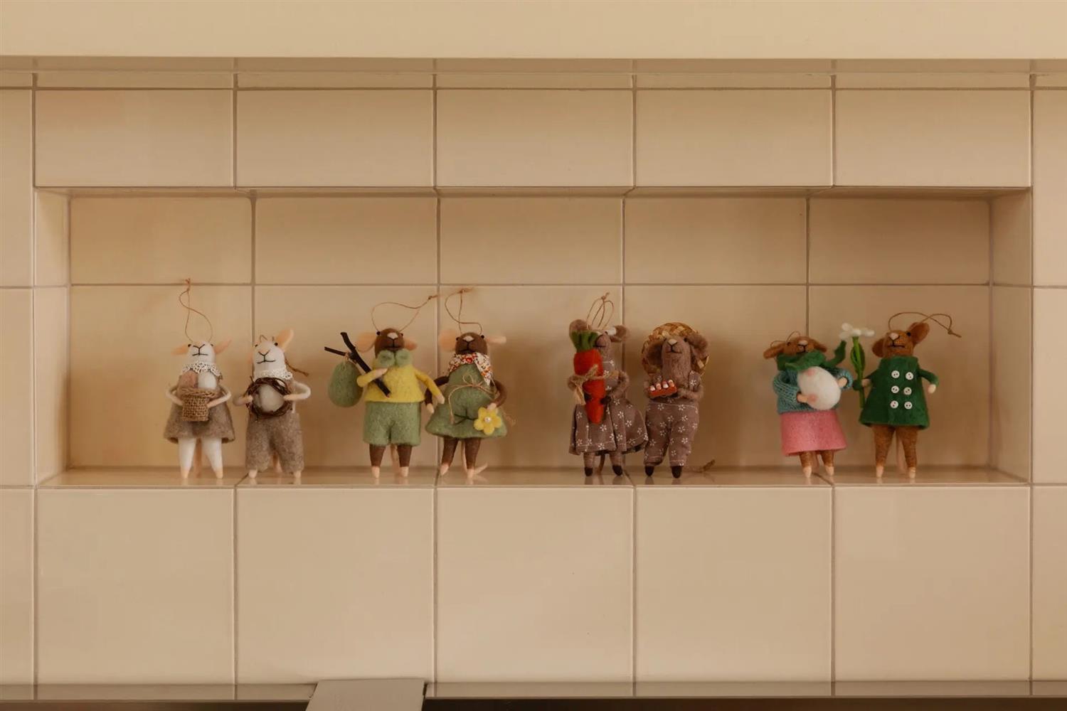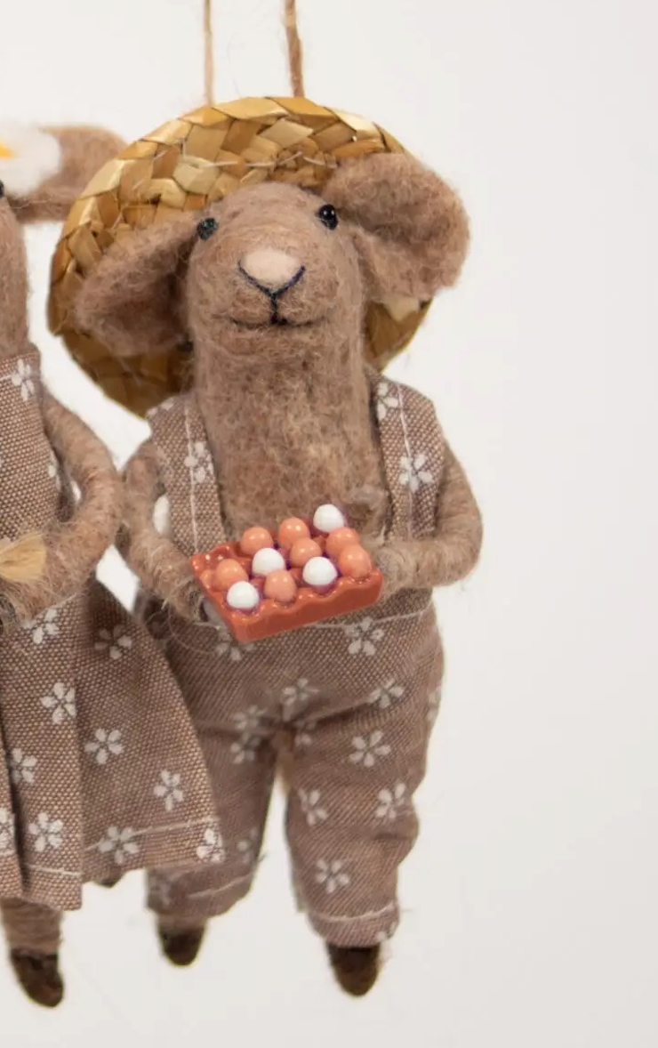 En sjarmerende, håndlaget påskemus i syntetisk ull, iført småmønstret antrekk og stråhatt. I hendene holder han et lite brett med pastellfargede egg – en koselig referanse til påskens tradisjoner.