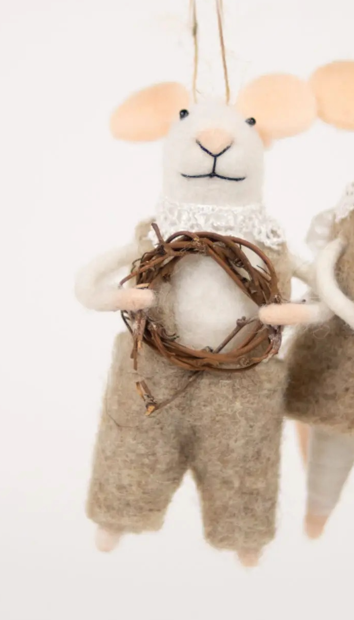 En håndlaget påskemus i myk syntetisk ull, kledd i naturtoner og med en dekorativ krans av små kvister i hendene. Den enkle fargepaletten og de fine blondedetaljene gir et lunt og nostalgisk uttrykk.