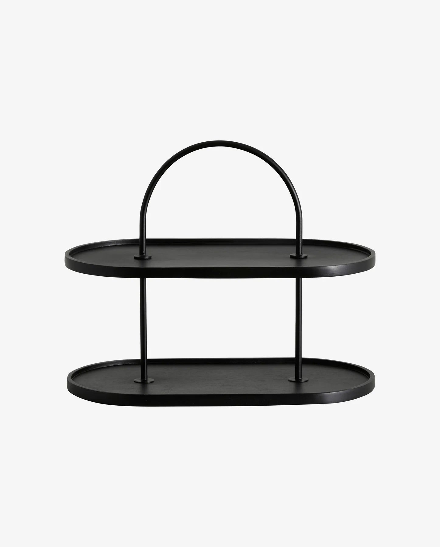 RUSSELL etasjefat fra Nordal tilfører et moderne og grafisk uttrykk til hjemmet. Den slanke, sorte konstruksjonen i kombinasjon med de to nivåene skaper en elegant balanse mellom funksjon og estetikk – perfekt for å fremheve små favoritter og dekorative detaljer.