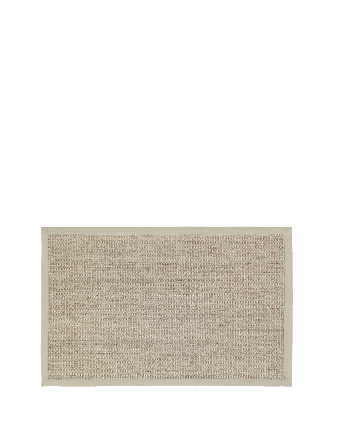 Jenny dørmatte i natur med bomullskant fra Dixie. Slitesterk dørmatte i sisal med bomullskant, og underside i latex for antiskli. Matten for innendørs bruk, og er maskinvevet i India.