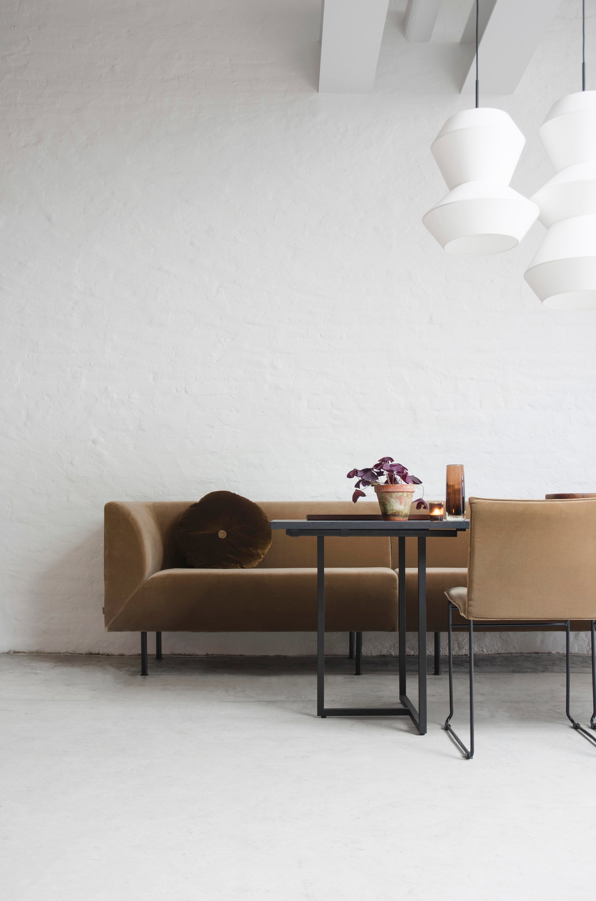 Aften kombinerer tidløs eleganse med moderne enkelhet og komfortable sitteplasser. Med inspirasjon fra teater og filmer, scener og sceneshow er det litt pompøst, uten å være for dramatisk. Faste puter og sjenerøst buede former gjør Aften til en spisesofa med personlighet. De enkle svarte pulverlakkerte stålbena skaper et svevende uttrykk.