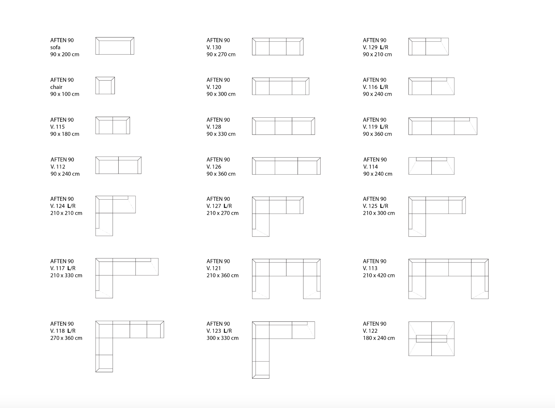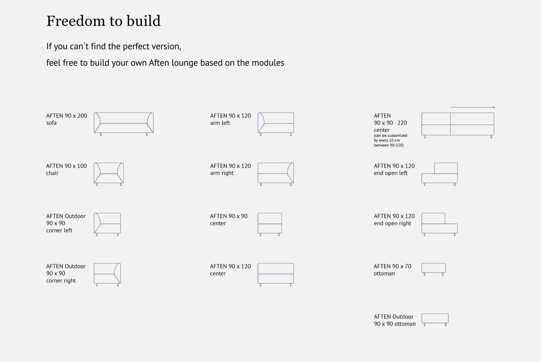 Aften 90 består av et stort utvalg av moduler som kan settes sammen etter ønske, i dybde 80 og 90, og som spisesofa.